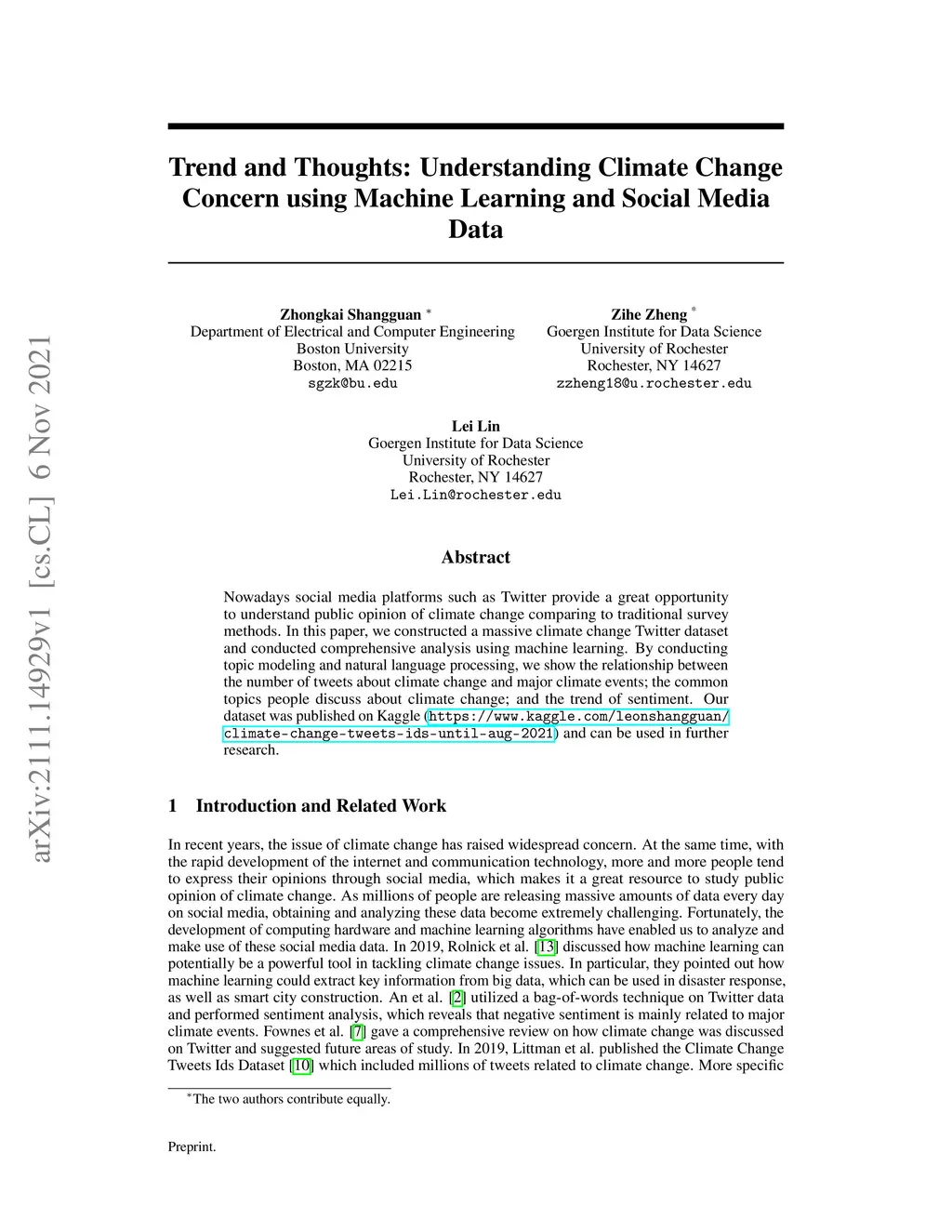 Nowadays social media platforms such as Twitter provide a great opportunity to understand public opinion of climate change compared to traditional survey methods. In this paper, we constructed a massive climate change Twitter dataset and conducted comprehensive analysis using machine learning. By conducting topic modeling and natural language processing, we show the relationship between the number of tweets about climate change and major climate events; the common topics people discuss climate change; and the trend of sentiment. Our dataset was published on Kaggle (\url{https://www.kaggle.com/leonshangguan/climate-change-tweets-ids-until-aug-2021}) and can be used in further research.