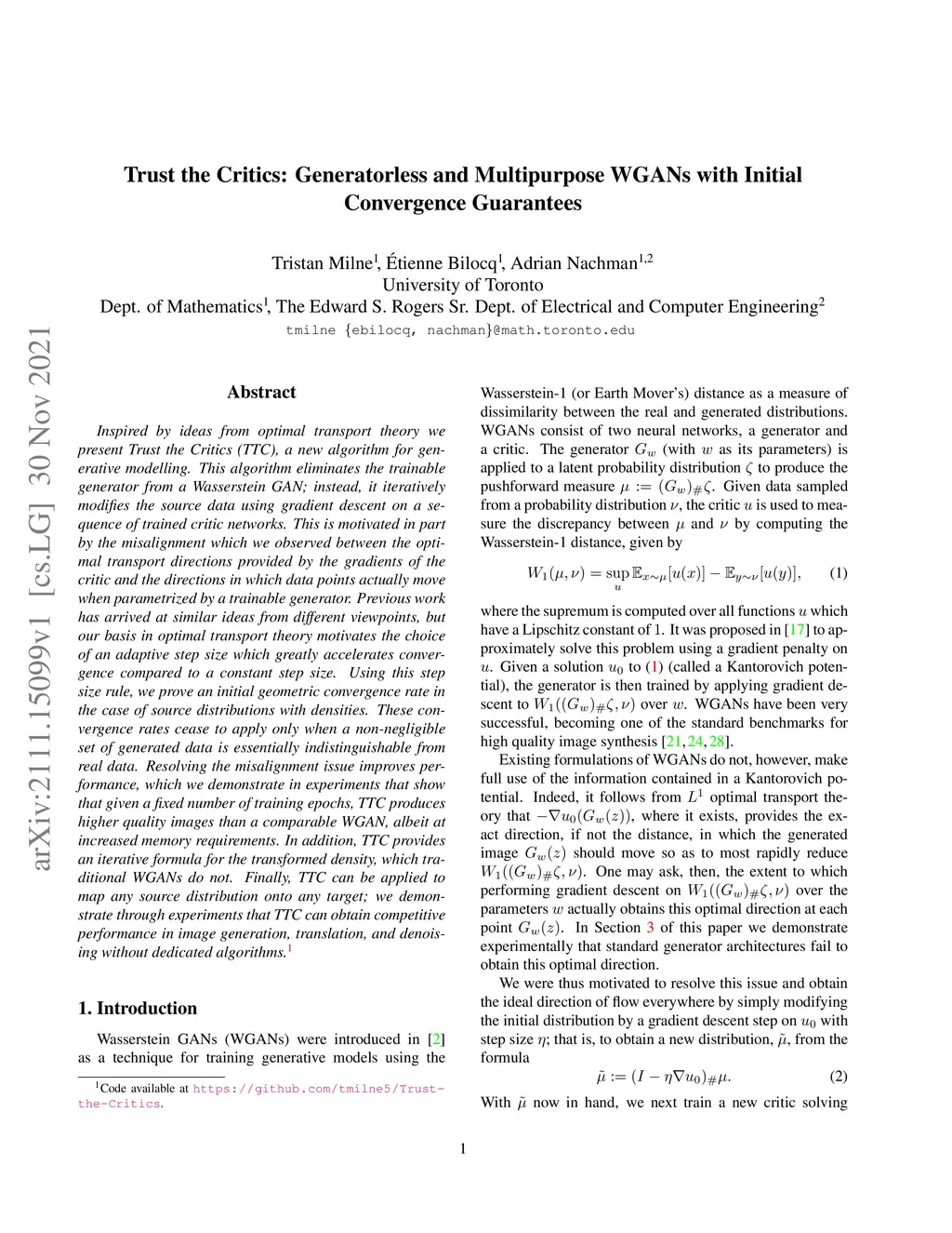 Inspired by ideas from optimal transport theory we present Trust the Critics (TTC), a new algorithm for generative modelling. This algorithm eliminates the trainable generator from a Wasserstein GAN; instead, it iteratively modifies the source data using gradient descent on a sequence of trained critic networks. This is motivated in part by the misalignment which we observed between the optimal transport directions provided by the gradients of the critic and the directions in which data points actually move when parametrized by a trainable generator. Previous work has arrived at similar ideas from different viewpoints, but our basis in optimal transport theory motivates the choice of an adaptive step size which greatly accelerates convergence compared to a constant step size. Using this step size rule, we prove an initial geometric convergence rate in the case of source distributions with densities. These convergence rates cease to apply only when a non-negligible set of generated data is essentially indistinguishable from real data. Resolving the misalignment issue improves performance, which we demonstrate in experiments that show that given a fixed number of training epochs, TTC produces higher quality images than a comparable WGAN, albeit at increased memory requirements. In addition, TTC provides an iterative formula for the transformed density, which traditional WGANs do not. Finally, TTC can be applied to map any source distribution onto any target; we demonstrate through experiments that TTC can obtain competitive performance in image generation, translation, and denoising without dedicated algorithms.