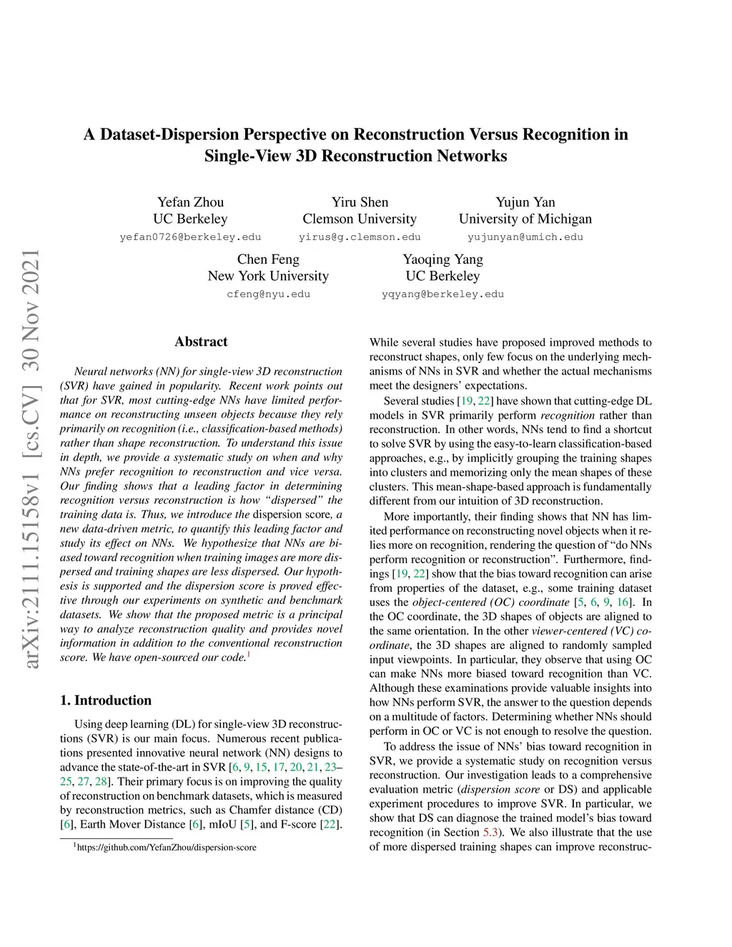 Neural networks (NN) for single-view 3D reconstruction (SVR) have gained in popularity. Recent work points out that for SVR, most cutting-edge NNs have limited performance on reconstructing unseen objects because they rely primarily on recognition (i.e., classification-based methods) rather than shape reconstruction. To understand this issue in depth, we provide a systematic study on when and why NNs prefer recognition to reconstruction and vice versa. Our finding shows that a leading factor in determining recognition versus reconstruction is how dispersed the training data is. Thus, we introduce the dispersion score, a new data-driven metric, to quantify this leading factor and study its effect on NNs. We hypothesize that NNs are biased toward recognition when training images are more dispersed and training shapes are less dispersed. Our hypothesis is supported and the dispersion score is proved effective through our experiments on synthetic and benchmark datasets. We show that the proposed metric is a principal way to analyze reconstruction quality and provides novel information in addition to the conventional reconstruction score.