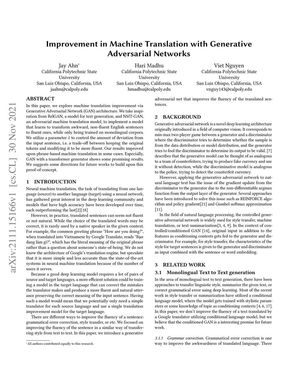 In this paper, we explore machine translation improvement via Generative Adversarial Network (GAN) architecture. We take inspiration from RelGAN, a model for text generation, and NMT-GAN, an adversarial machine translation model, to implement a model that learns to transform awkward, non-fluent English sentences to fluent ones, while only being trained on monolingual corpora. We utilize a parameter to control the amount of deviation from the input sentence, i.e. a trade-off between keeping the original tokens and modifying it to be more fluent. Our results improved upon phrase-based machine translation in some cases. Especially, GAN with a transformer generator shows some promising results. We suggests some directions for future works to build upon this proof-of-concept.
