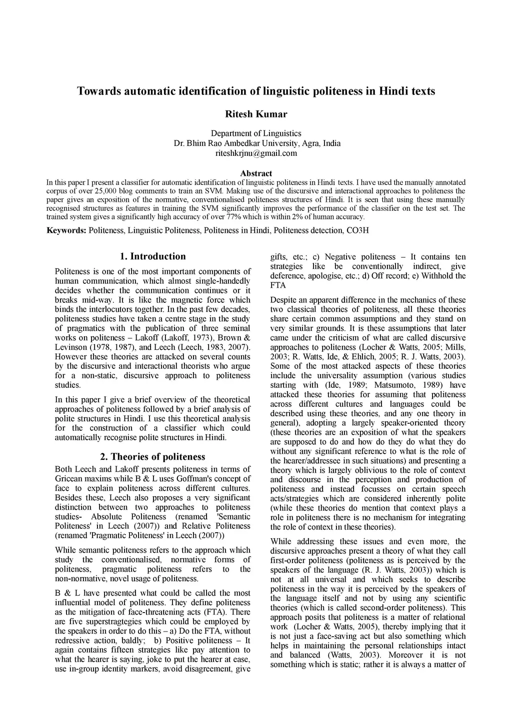 Towards automatic identification of linguistic politeness in Hindi texts