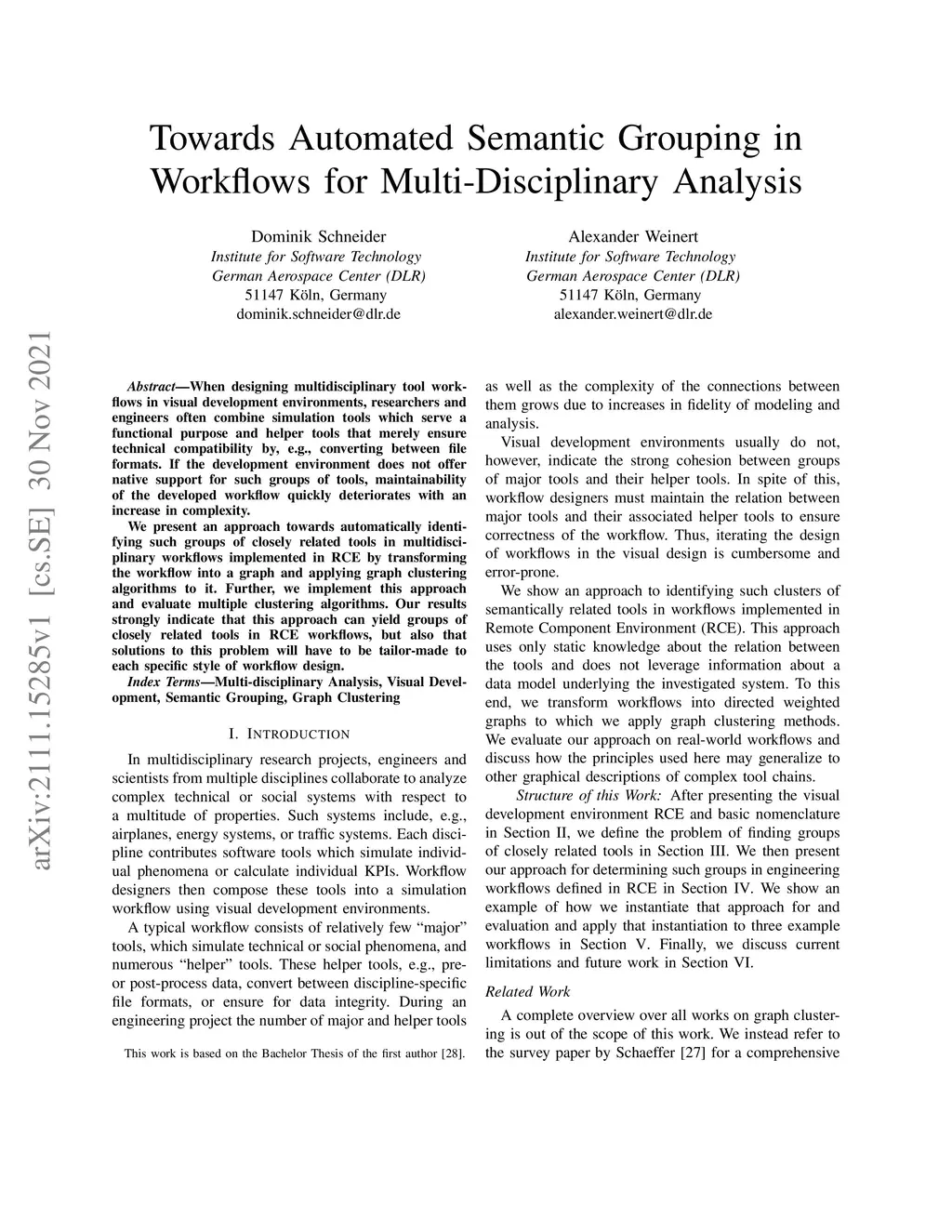 When designing multidisciplinary tool workflows in visual development environments, researchers and engineers often combine simulation tools which serve a functional purpose and helper tools that merely ensure technical compatibility by, e.g., converting between file formats. If the development environment does not offer native support for such groups of tools, maintainability of the developed workflow quickly deteriorates with an increase in complexity. We present an approach towards automatically identifying such groups of closely related tools in multidisciplinary workflows implemented in RCE by transforming the workflow into a graph and applying graph clustering algorithms to it. Further, we implement this approach and evaluate multiple clustering algorithms. Our results strongly indicate that this approach can yield groups of closely related tools in RCE workflows, but also that solutions to this problem will have to be tailor-made to each specific style of workflow design.