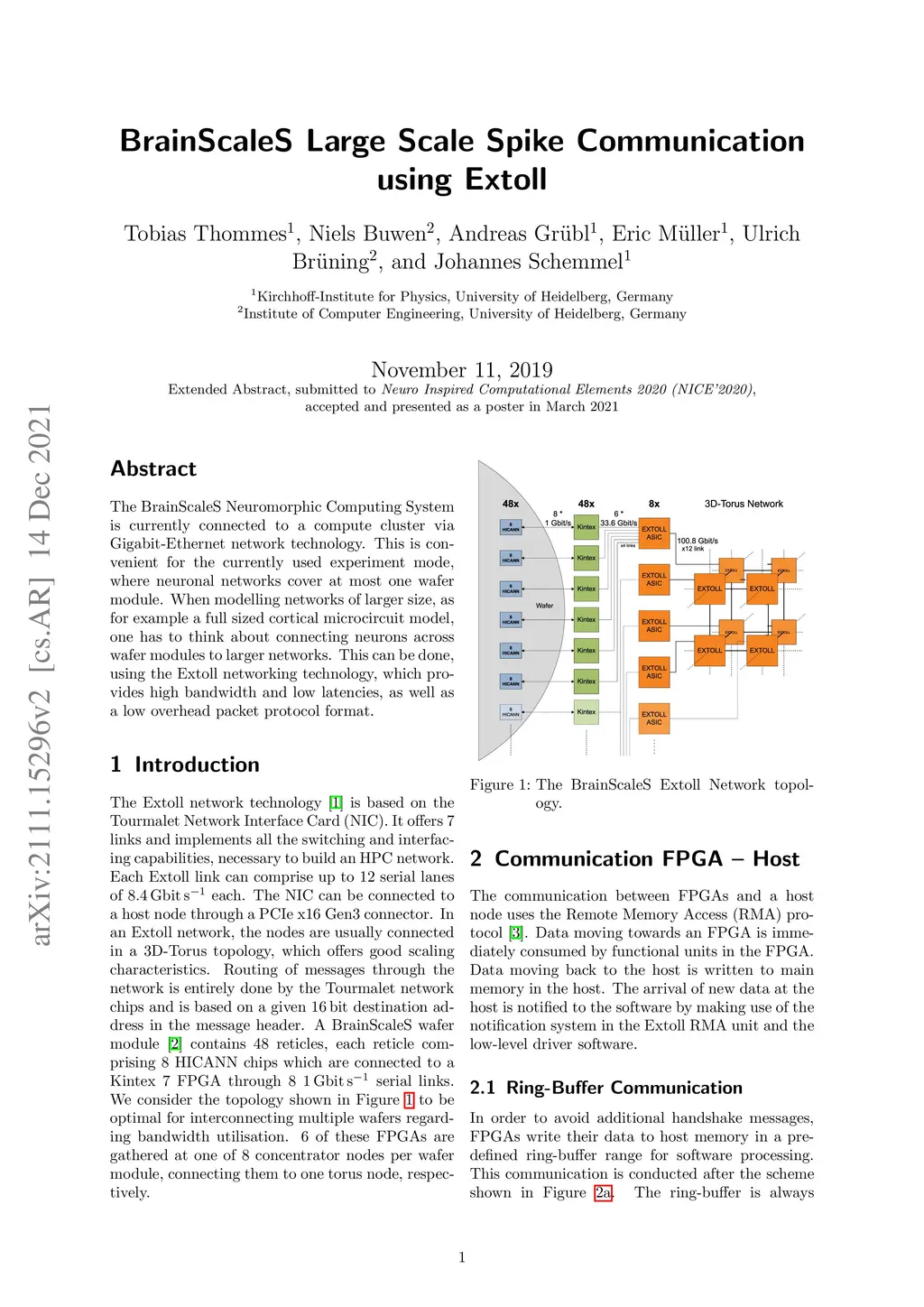The BrainScaleS Neuromorphic Computing System is currently connected to a compute cluster via Gigabit-Ethernet network technology. This is convenient for the currently used experiment mode, where neuronal networks cover at most one wafer module. When modelling networks of larger size, as for example a full sized cortical microcircuit model, one has to think about connecting neurons across wafer modules to larger networks. This can be done, using the Extoll networking technology, which provides high bandwidth and low latencies, as well as a low overhead packet protocol format.