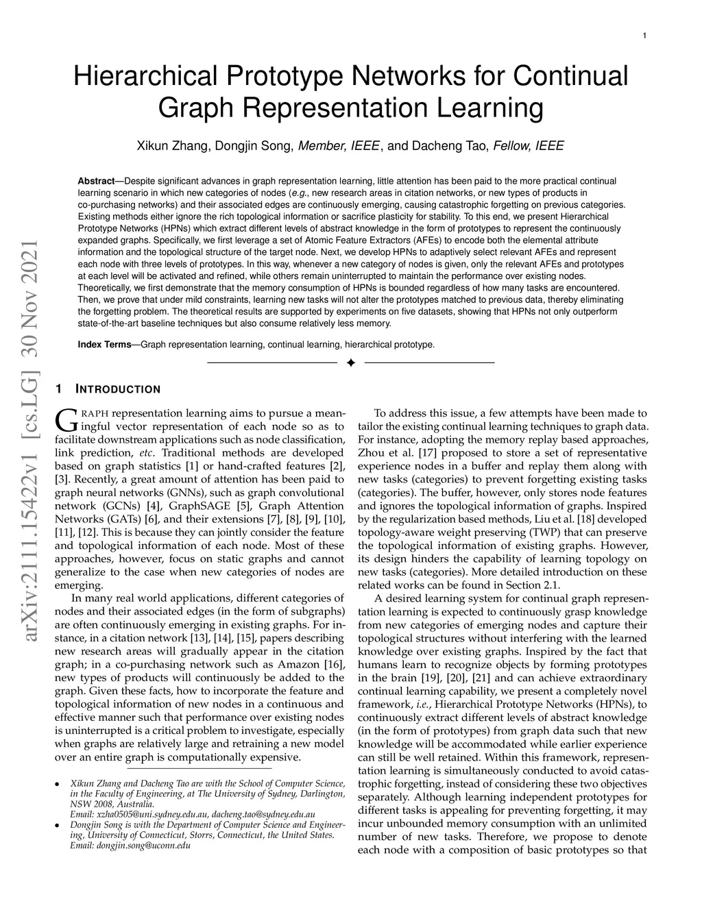 Despite significant advances in graph representation learning, little attention has been paid to the more practical continual learning scenario in which new categories of nodes (e.g., new research areas in citation networks, or new types of products in co-purchasing networks) and their associated edges are continuously emerging, causing catastrophic forgetting on previous categories. Existing methods either ignore the rich topological information or sacrifice plasticity for stability. To this end, we present Hierarchical Prototype Networks (HPNs) which extract different levels of abstract knowledge in the form of prototypes to represent the continuously expanded graphs. Specifically, we first leverage a set of Atomic Feature Extractors (AFEs) to encode both the elemental attribute information and the topological structure of the target node. Next, we develop HPNs to adaptively select relevant AFEs and represent each node with three levels of prototypes. In this way, whenever a new category of nodes is given, only the relevant AFEs and prototypes at each level will be activated and refined, while others remain uninterrupted to maintain the performance over existing nodes. Theoretically, we first demonstrate that the memory consumption of HPNs is bounded regardless of how many tasks are encountered. Then, we prove that under mild constraints, learning new tasks will not alter the prototypes matched to previous data, thereby eliminating the forgetting problem. The theoretical results are supported by experiments on five datasets, showing that HPNs not only outperform state-of-the-art baseline techniques but also consume relatively less memory.