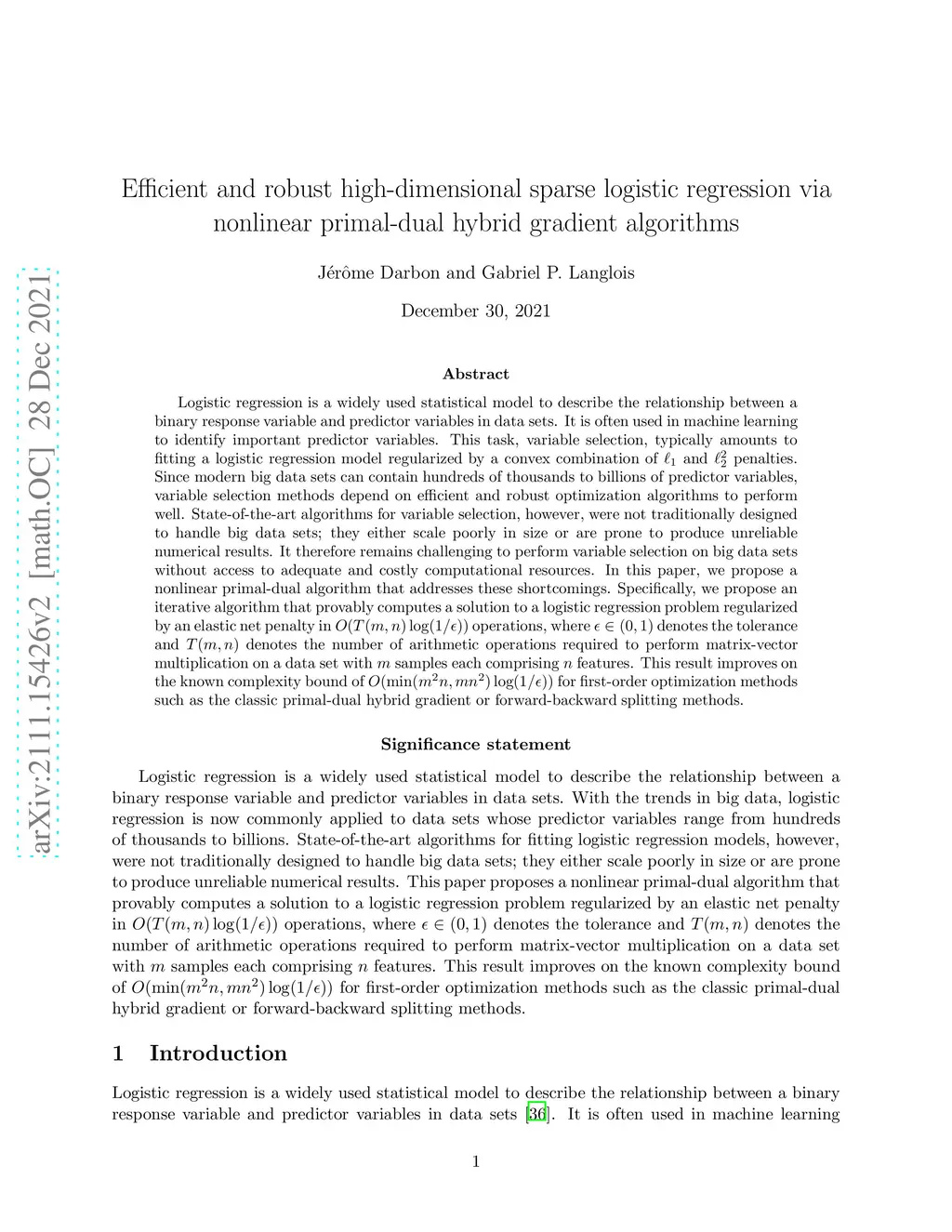 Logistic regression is a widely used statistical model to describe the relationship between a binary response variable and predictor variables in data sets. It is often used in machine learning to identify important predictor variables. This task, variable selection, typically amounts to fitting a logistic regression model regularized by a convex combination of and penalties. Since modern big data sets can contain hundreds of thousands to billions of predictor variables, variable selection methods depend on efficient and robust optimization algorithms to perform well. State-of-the-art algorithms for variable selection, however, were not traditionally designed to handle big data sets; they either scale poorly in size or are prone to produce unreliable numerical results. It therefore remains challenging to perform variable selection on big data sets without access to adequate and costly computational resources. In this paper, we propose a nonlinear primal-dual algorithm that addresses these shortcomings. Specifically, we propose an iterative algorithm that provably computes a solution to a logistic regression problem regularized by an elastic net penalty in operations, where denotes the tolerance and denotes the number of arithmetic operations required to perform matrix-vector multiplication on a data set with samples each comprising features. This result improves on the known complexity bound of for first-order optimization methods such as the classic primal-dual hybrid gradient or forward-backward splitting methods.