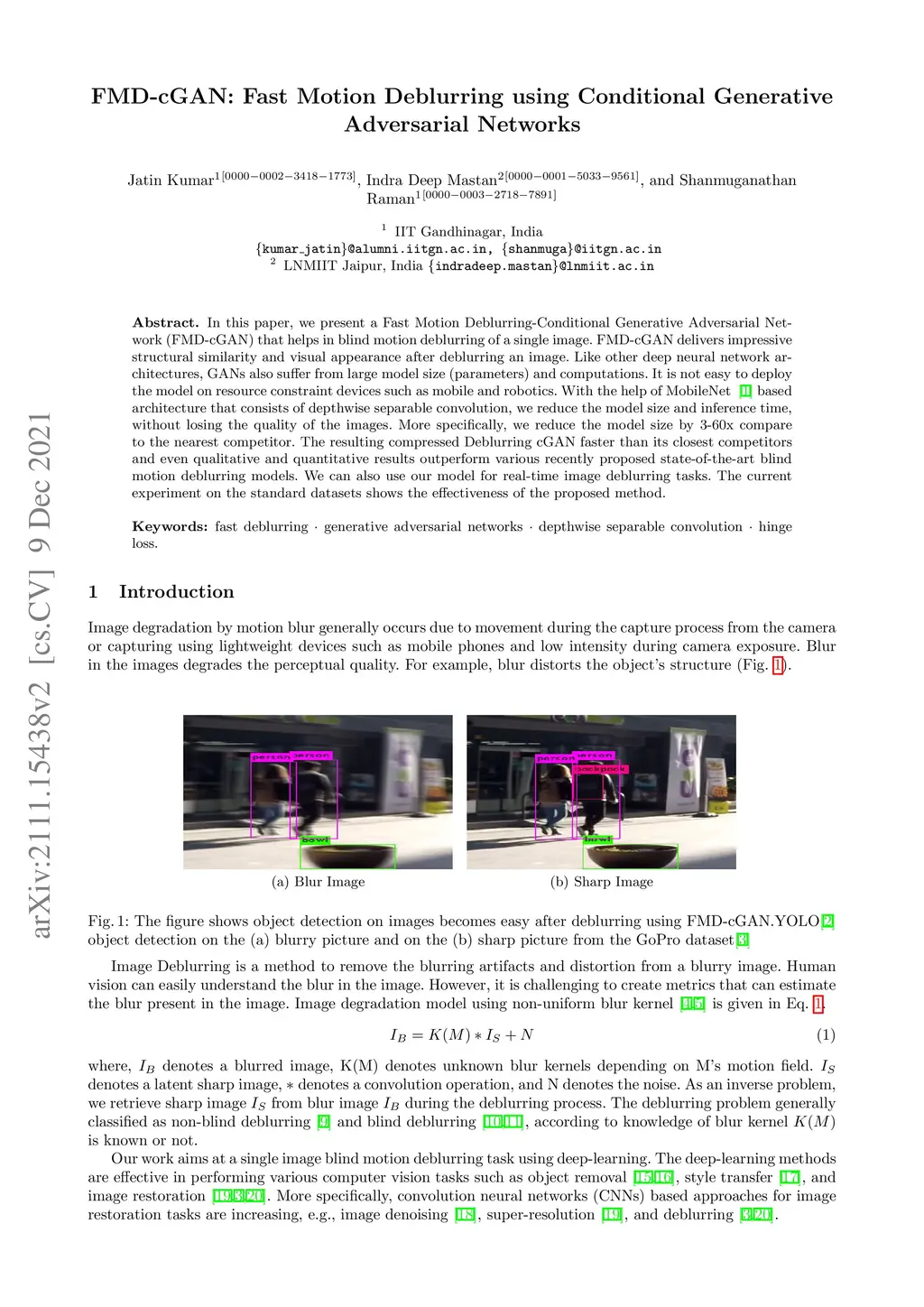 FMD-cGAN: Fast Motion Deblurring using Conditional Generative