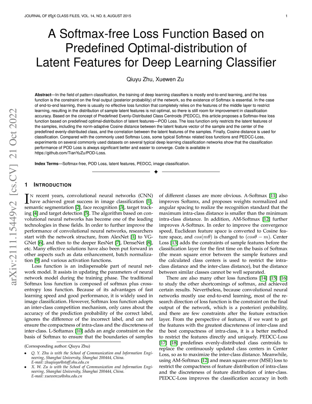 In the field of pattern classification, the training of deep learning classifiers is mostly end-to-end learning, and the loss function is the constraint on the final output (posterior probability) of the network, so the existence of Softmax is essential. In the case of end-to-end learning, there is usually no effective loss function that completely relies on the features of the middle layer to restrict learning, resulting in the distribution of sample latent features is not optimal, so there is still room for improvement in classification accuracy. Based on the concept of Predefined Evenly-Distributed Class Centroids (PEDCC), this article proposes a Softmax-free loss function based on predefined optimal-distribution of latent features-POD Loss. The loss function only restricts the latent features of the samples, including the norm-adaptive Cosine distance between the latent feature vector of the sample and the center of the predefined evenly-distributed class, and the correlation between the latent features of the samples. Finally, Cosine distance is used for classification. Compared with the commonly used Softmax Loss, some typical Softmax related loss functions and PEDCC-Loss, experiments on several commonly used datasets on several typical deep learning classification networks show that the classification performance of POD Loss is always significant better and easier to converge. Code is available in https://github.com/TianYuZu/POD-Loss.