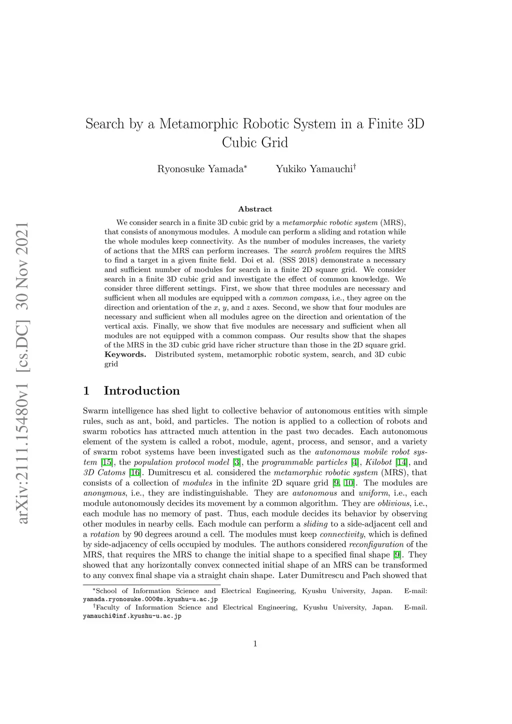Search by a Metamorphic Robotic System in a Finite 3D Cubic Grid