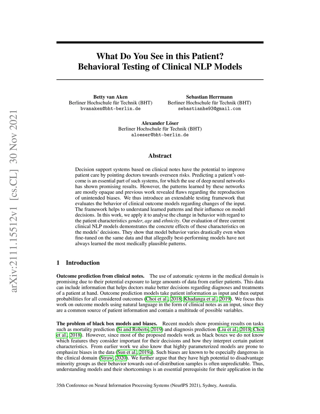 Decision support systems based on clinical notes have the potential to improve patient care by pointing doctors towards overseen risks. Predicting a patient's outcome is an essential part of such systems, for which the use of deep neural networks has shown promising results. However, the patterns learned by these networks are mostly opaque and previous work revealed flaws regarding the reproduction of unintended biases. We thus introduce an extendable testing framework that evaluates the behavior of clinical outcome models regarding changes of the input. The framework helps to understand learned patterns and their influence on model decisions. In this work, we apply it to analyse the change in behavior with regard to the patient characteristics gender, age and ethnicity. Our evaluation of three current clinical NLP models demonstrates the concrete effects of these characteristics on the models' decisions. They show that model behavior varies drastically even when fine-tuned on the same data and that allegedly best-performing models have not always learned the most medically plausible patterns.