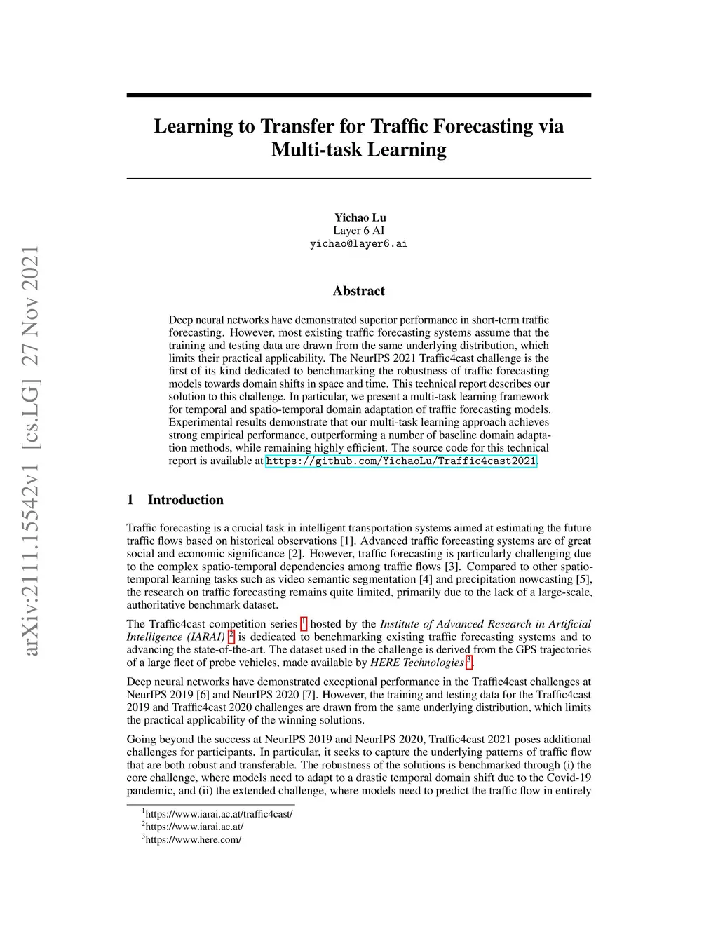 Deep neural networks have demonstrated superior performance in short-term traffic forecasting. However, most existing traffic forecasting systems assume that the training and testing data are drawn from the same underlying distribution, which limits their practical applicability. The NeurIPS 2021 Traffic4cast challenge is the first of its kind dedicated to benchmarking the robustness of traffic forecasting models towards domain shifts in space and time. This technical report describes our solution to this challenge. In particular, we present a multi-task learning framework for temporal and spatio-temporal domain adaptation of traffic forecasting models. Experimental results demonstrate that our multi-task learning approach achieves strong empirical performance, outperforming a number of baseline domain adaptation methods, while remaining highly efficient. The source code for this technical report is available at https://github.com/YichaoLu/Traffic4cast2021.