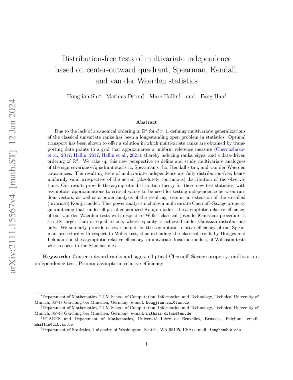 center-outward quadrant, Spearman, Kendall, and van der Waerden statistics
