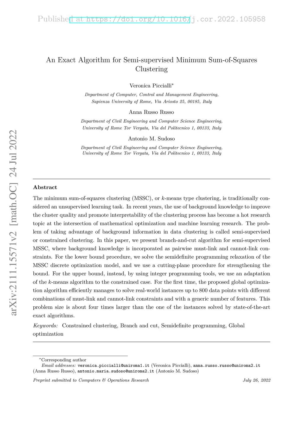 The minimum sum-of-squares clustering (MSSC), or k-means type clustering, is traditionally considered an unsupervised learning task. In recent years, the use of background knowledge to improve the cluster quality and promote interpretability of the clustering process has become a hot research topic at the intersection of mathematical optimization and machine learning research. The problem of taking advantage of background information in data clustering is called semi-supervised or constrained clustering. In this paper, we present a branch-and-cut algorithm for semi-supervised MSSC, where background knowledge is incorporated as pairwise must-link and cannot-link constraints. For the lower bound procedure, we solve the semidefinite programming relaxation of the MSSC discrete optimization model, and we use a cutting-plane procedure for strengthening the bound. For the upper bound, instead, by using integer programming tools, we use an adaptation of the k-means algorithm to the constrained case. For the first time, the proposed global optimization algorithm efficiently manages to solve real-world instances up to 800 data points with different combinations of must-link and cannot-link constraints and with a generic number of features. This problem size is about four times larger than the one of the instances solved by state-of-the-art exact algorithms.