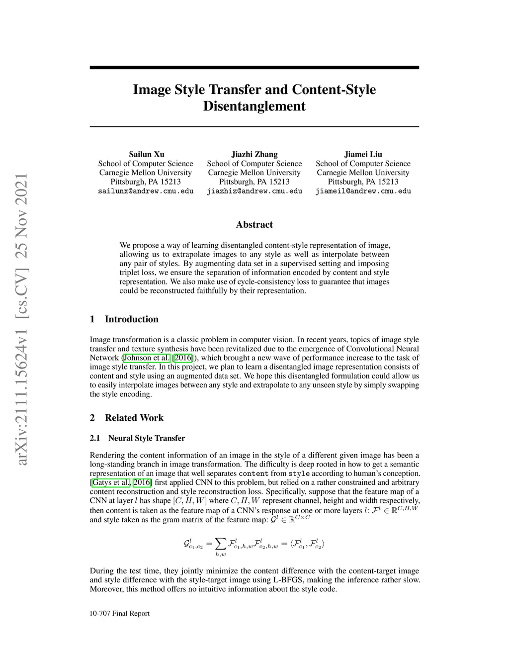 Image Style Transfer and Content-Style Disentanglement