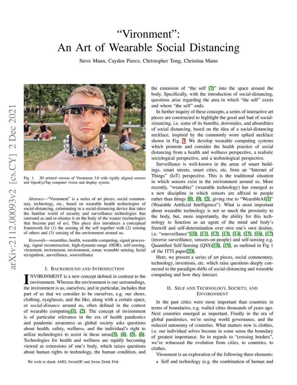 "Vironment" is a series of art pieces, social commentary, technology, etc., based on wearable health technologies of social-distancing, culminating in a social-distancing device that takes the familiar world of security and surveillance technologies that surround us and re-situates it on the body of the wearer (technologies that become part of us). This piece also introduces a conceptual framework for (1) the sensing of the self together with (2) sensing of others and (3) sensing of the environment around us.