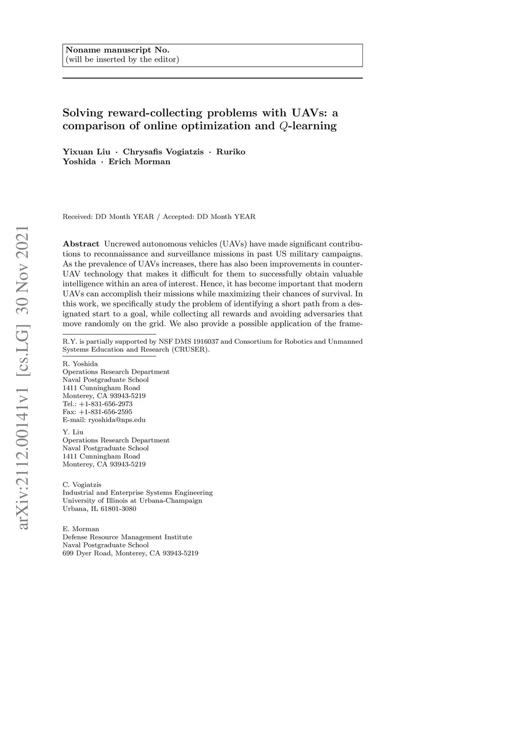 Uncrewed autonomous vehicles (UAVs) have made significant contributions to reconnaissance and surveillance missions in past US military campaigns. As the prevalence of UAVs increases, there has also been improvements in counter-UAV technology that makes it difficult for them to successfully obtain valuable intelligence within an area of interest. Hence, it has become important that modern UAVs can accomplish their missions while maximizing their chances of survival. In this work, we specifically study the problem of identifying a short path from a designated start to a goal, while collecting all rewards and avoiding adversaries that move randomly on the grid. We also provide a possible application of the framework in a military setting, that of autonomous casualty evacuation. We present a comparison of three methods to solve this problem: namely we implement a Deep Q-Learning model, an -greedy tabular Q-Learning model, and an online optimization framework. Our computational experiments, designed using simple grid-world environments with random adversaries showcase how these approaches work and compare them in terms of performance, accuracy, and computational time.