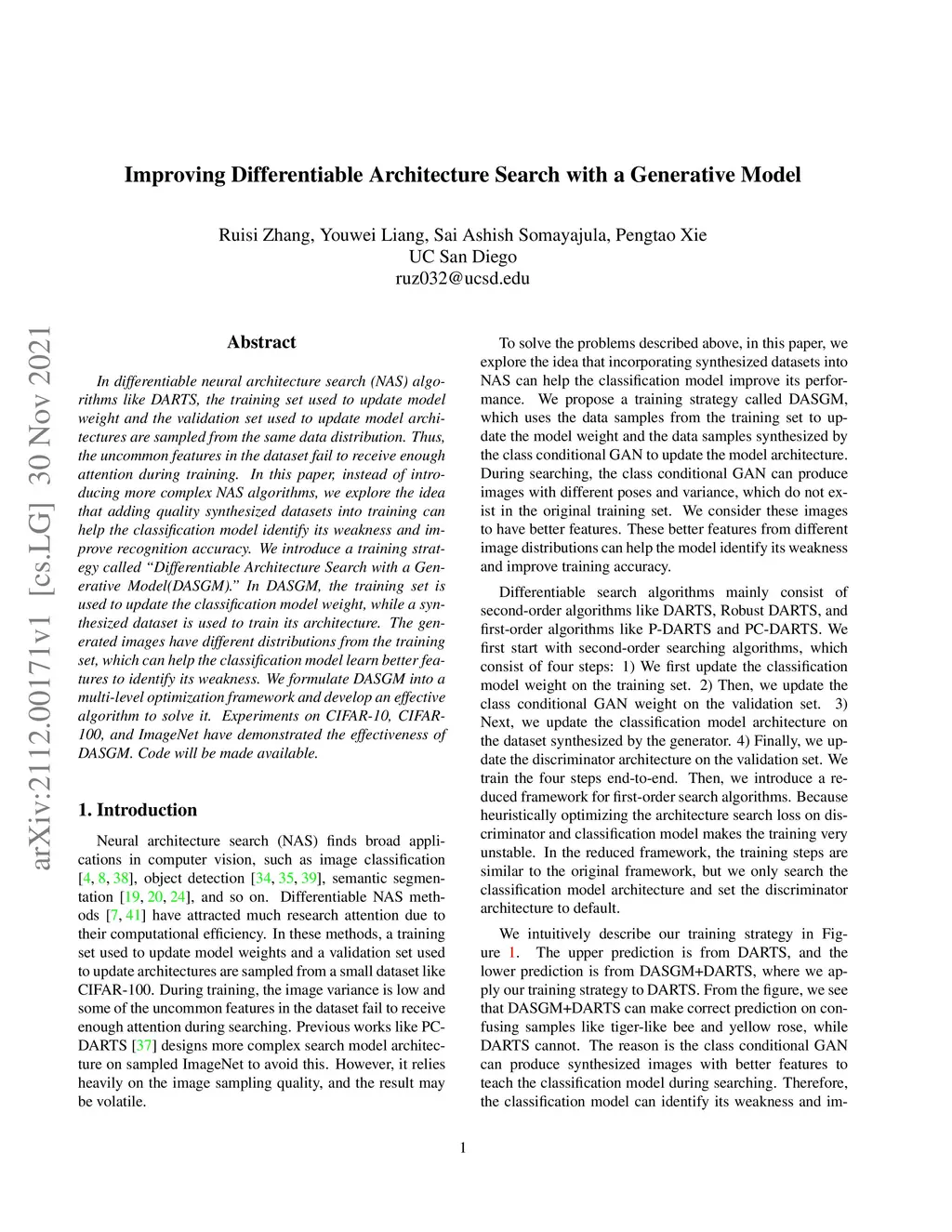 In differentiable neural architecture search (NAS) algorithms like DARTS, the training set used to update model weight and the validation set used to update model architectures are sampled from the same data distribution. Thus, the uncommon features in the dataset fail to receive enough attention during training. In this paper, instead of introducing more complex NAS algorithms, we explore the idea that adding quality synthesized datasets into training can help the classification model identify its weakness and improve recognition accuracy. We introduce a training strategy called ``Differentiable Architecture Search with a Generative Model(DASGM)." In DASGM, the training set is used to update the classification model weight, while a synthesized dataset is used to train its architecture. The generated images have different distributions from the training set, which can help the classification model learn better features to identify its weakness. We formulate DASGM into a multi-level optimization framework and develop an effective algorithm to solve it. Experiments on CIFAR-10, CIFAR-100, and ImageNet have demonstrated the effectiveness of DASGM. Code will be made available.