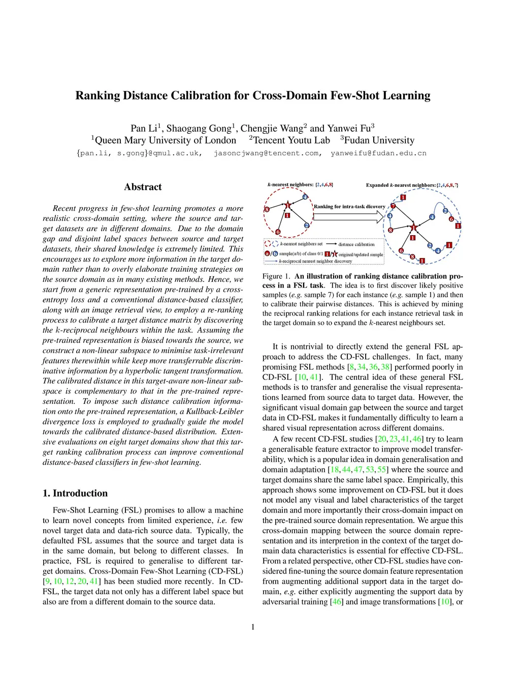 Recent progress in few-shot learning promotes a more realistic cross-domain setting, where the source and target datasets are from different domains. Due to the domain gap and disjoint label spaces between source and target datasets, their shared knowledge is extremely limited. This encourages us to explore more information in the target domain rather than to overly elaborate training strategies on the source domain as in many existing methods. Hence, we start from a generic representation pre-trained by a cross-entropy loss and a conventional distance-based classifier, along with an image retrieval view, to employ a re-ranking process for calibrating a target distance matrix by discovering the reciprocal k-nearest neighbours within the task. Assuming the pre-trained representation is biased towards the source, we construct a non-linear subspace to minimise task-irrelevant features therewithin while keep more transferrable discriminative information by a hyperbolic tangent transformation. The calibrated distance in this target-aware non-linear subspace is complementary to that in the pre-trained representation. To impose such distance calibration information onto the pre-trained representation, a Kullback-Leibler divergence loss is employed to gradually guide the model towards the calibrated distance-based distribution. Extensive evaluations on eight target domains show that this target ranking calibration process can improve conventional distance-based classifiers in few-shot learning.