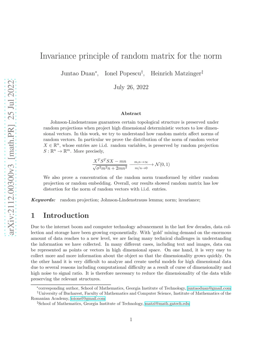 Johnson-Lindenstrauss guarantees certain topological structure is preserved under random projections when project high dimensional deterministic vectors to low dimensional vectors. In this work, we try to understand how random matrix affect norms of random vectors. In particular we prove the distribution of the norm of random vector , whose entries are i.i.d. random variables, is preserved by random projection . More precisely, \[ \frac{X^TS^TSX - mn}{\sqrt{\sigma^2 m^2n+2mn^2}} \xrightarrow[\quad m/n\to 0 \quad ]{ m,n\to \infty } \mathcal{N}(0,1) \] We also prove a concentration of the random norm transformed by either random projection or random embedding. Overall, our results showed random matrix has low distortion for the norm of random vectors with i.i.d. entries.