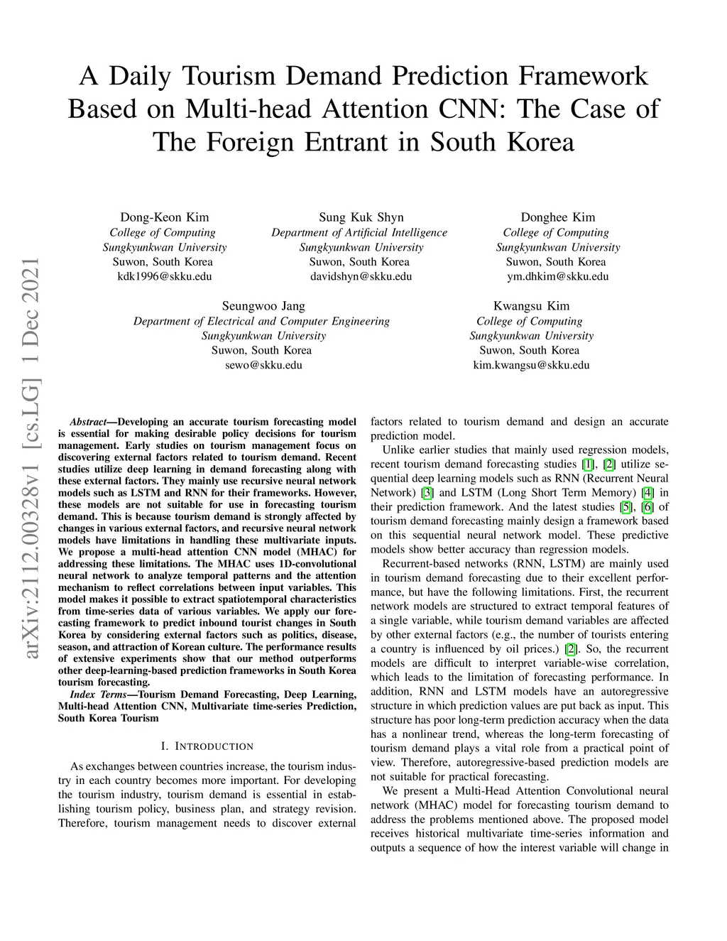 Developing an accurate tourism forecasting model is essential for making desirable policy decisions for tourism management. Early studies on tourism management focus on discovering external factors related to tourism demand. Recent studies utilize deep learning in demand forecasting along with these external factors. They mainly use recursive neural network models such as LSTM and RNN for their frameworks. However, these models are not suitable for use in forecasting tourism demand. This is because tourism demand is strongly affected by changes in various external factors, and recursive neural network models have limitations in handling these multivariate inputs. We propose a multi-head attention CNN model (MHAC) for addressing these limitations. The MHAC uses 1D-convolutional neural network to analyze temporal patterns and the attention mechanism to reflect correlations between input variables. This model makes it possible to extract spatiotemporal characteristics from time-series data of various variables. We apply our forecasting framework to predict inbound tourist changes in South Korea by considering external factors such as politics, disease, season, and attraction of Korean culture. The performance results of extensive experiments show that our method outperforms other deep-learning-based prediction frameworks in South Korea tourism forecasting.