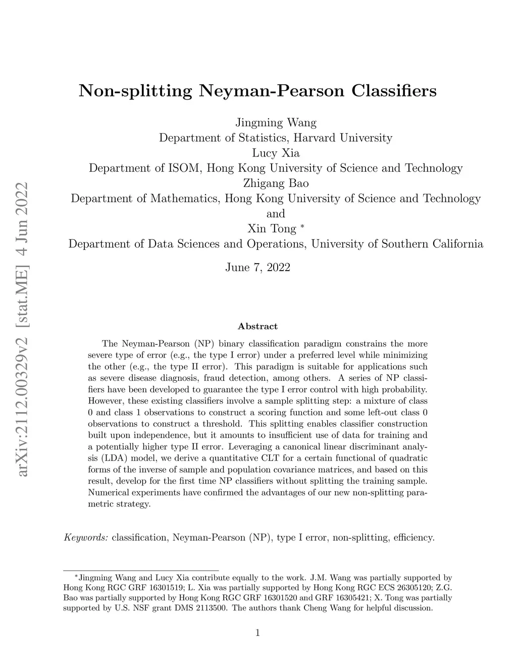 The Neyman-Pearson (NP) binary classification paradigm constrains the more severe type of error (e.g., the type I error) under a preferred level while minimizing the other (e.g., the type II error). This paradigm is suitable for applications such as severe disease diagnosis, fraud detection, among others. A series of NP classifiers have been developed to guarantee the type I error control with high probability. However, these existing classifiers involve a sample splitting step: a mixture of class 0 and class 1 observations to construct a scoring function and some left-out class 0 observations to construct a threshold. This splitting enables classifier construction built upon independence, but it amounts to insufficient use of data for training and a potentially higher type II error. Leveraging a canonical linear discriminant analysis model, we derive a quantitative CLT for a certain functional of quadratic forms of the inverse of sample and population covariance matrices, and based on this result, develop for the first time NP classifiers without splitting the training sample. Numerical experiments have confirmed the advantages of our new non-splitting parametric strategy.