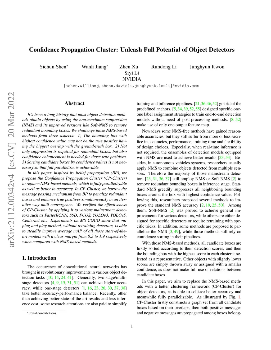 It has been a long history that most object detection methods obtain objects by using the non-maximum suppression (NMS) and its improved versions like Soft-NMS to remove redundant bounding boxes. We challenge those NMS-based methods from three aspects: 1) The bounding box with highest confidence value may not be the true positive having the biggest overlap with the ground-truth box. 2) Not only suppression is required for redundant boxes, but also confidence enhancement is needed for those true positives. 3) Sorting candidate boxes by confidence values is not necessary so that full parallelism is achievable. In this paper, inspired by belief propagation (BP), we propose the Confidence Propagation Cluster (CP-Cluster) to replace NMS-based methods, which is fully parallelizable as well as better in accuracy. In CP-Cluster, we borrow the message passing mechanism from BP to penalize redundant boxes and enhance true positives simultaneously in an iterative way until convergence. We verified the effectiveness of CP-Cluster by applying it to various mainstream detectors such as FasterRCNN, SSD, FCOS, YOLOv3, YOLOv5, Centernet etc. Experiments on MS COCO show that our plug and play method, without retraining detectors, is able to steadily improve average mAP of all those state-of-the-art models with a clear margin from 0.3 to 1.9 respectively when compared with NMS-based methods.