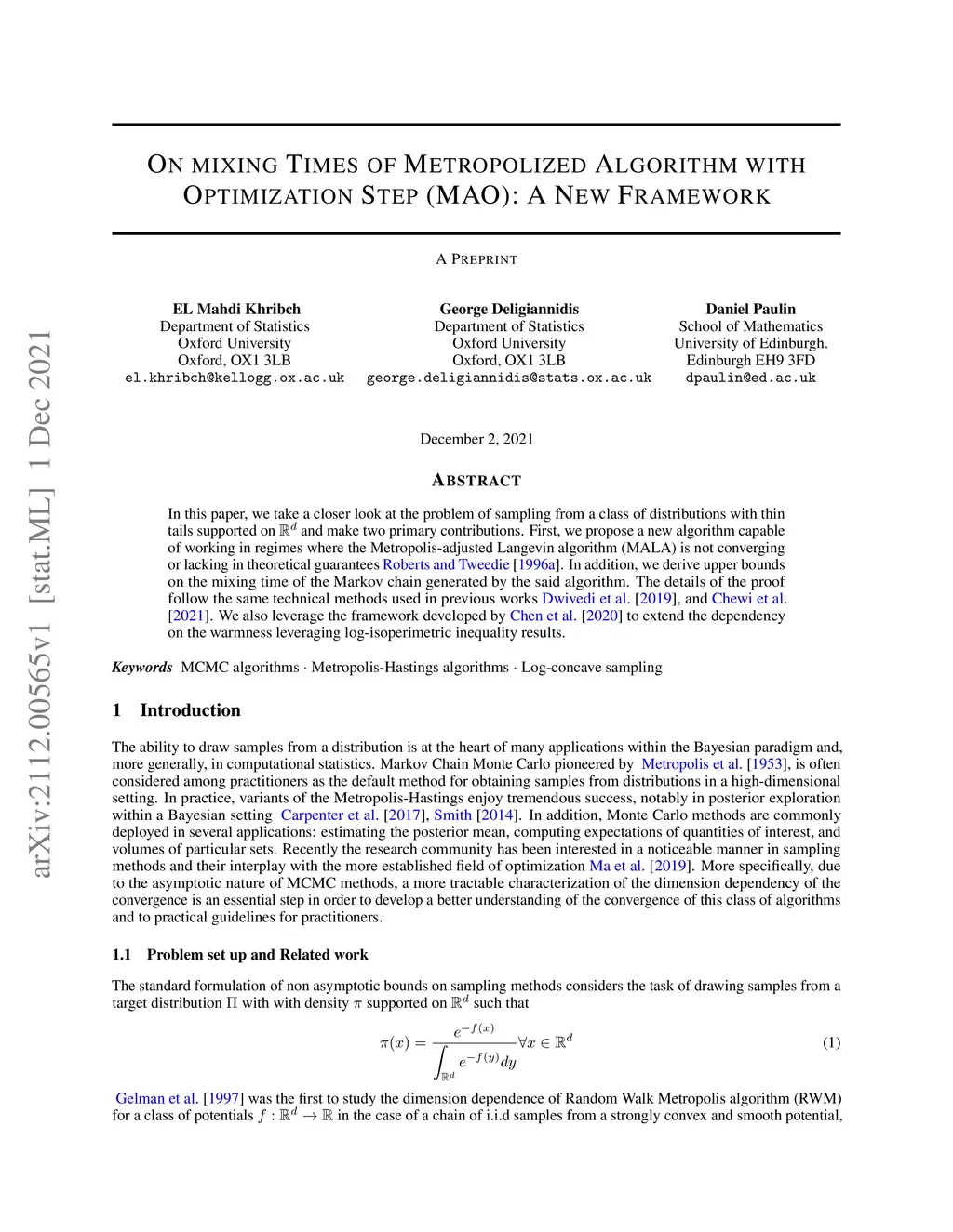 In this paper, we consider sampling from a class of distributions with thin tails supported on and make two primary contributions. First, we propose a new Metropolized Algorithm With Optimization Step (MAO), which is well suited for such targets. Our algorithm is capable of sampling from distributions where the Metropolis-adjusted Langevin algorithm (MALA) is not converging or lacking in theoretical guarantees. Second, we derive upper bounds on the mixing time of MAO. Our results are supported by simulations on multiple target distributions.