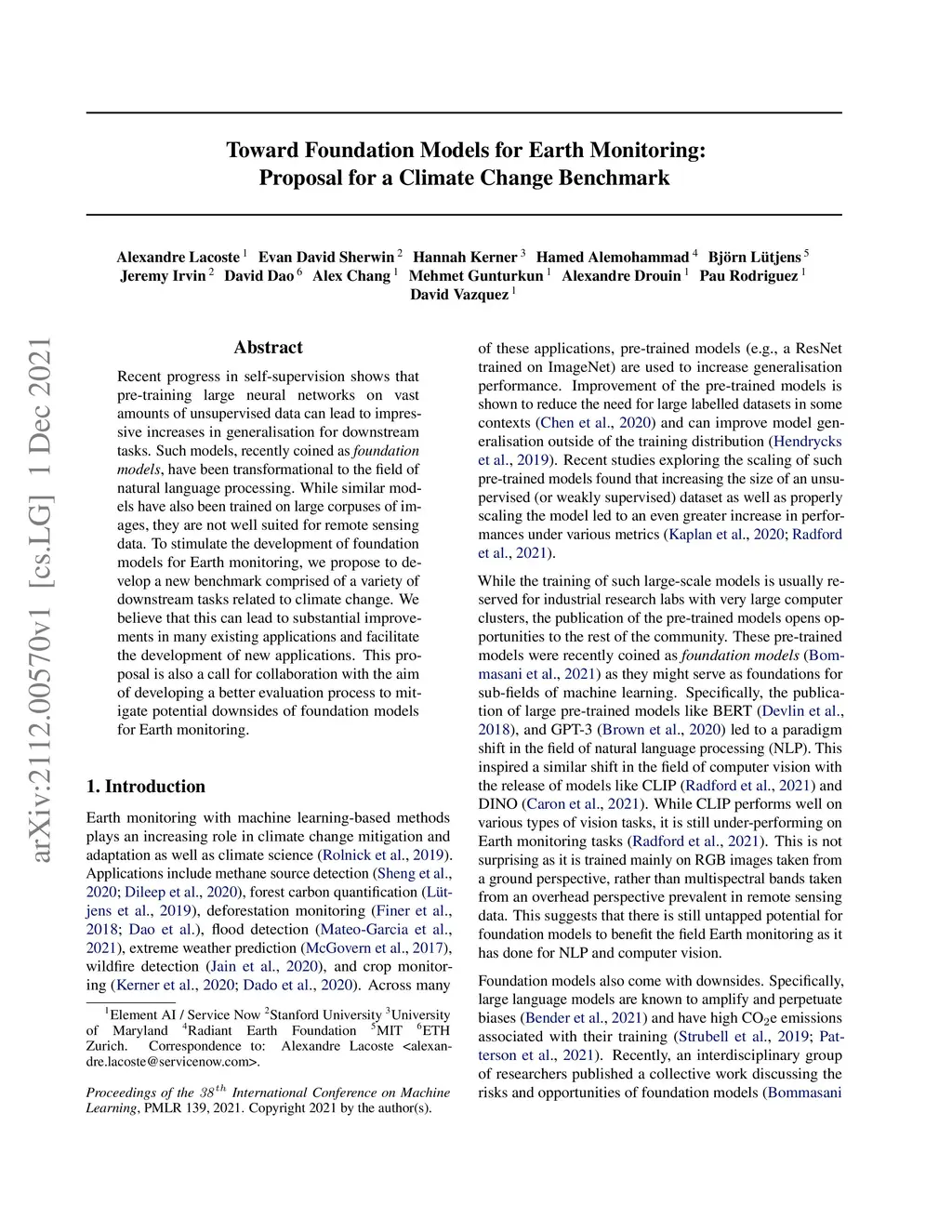 Recent progress in self-supervision shows that pre-training large neural networks on vast amounts of unsupervised data can lead to impressive increases in generalisation for downstream tasks. Such models, recently coined as foundation models, have been transformational to the field of natural language processing. While similar models have also been trained on large corpuses of images, they are not well suited for remote sensing data. To stimulate the development of foundation models for Earth monitoring, we propose to develop a new benchmark comprised of a variety of downstream tasks related to climate change. We believe that this can lead to substantial improvements in many existing applications and facilitate the development of new applications. This proposal is also a call for collaboration with the aim of developing a better evaluation process to mitigate potential downsides of foundation models for Earth monitoring.