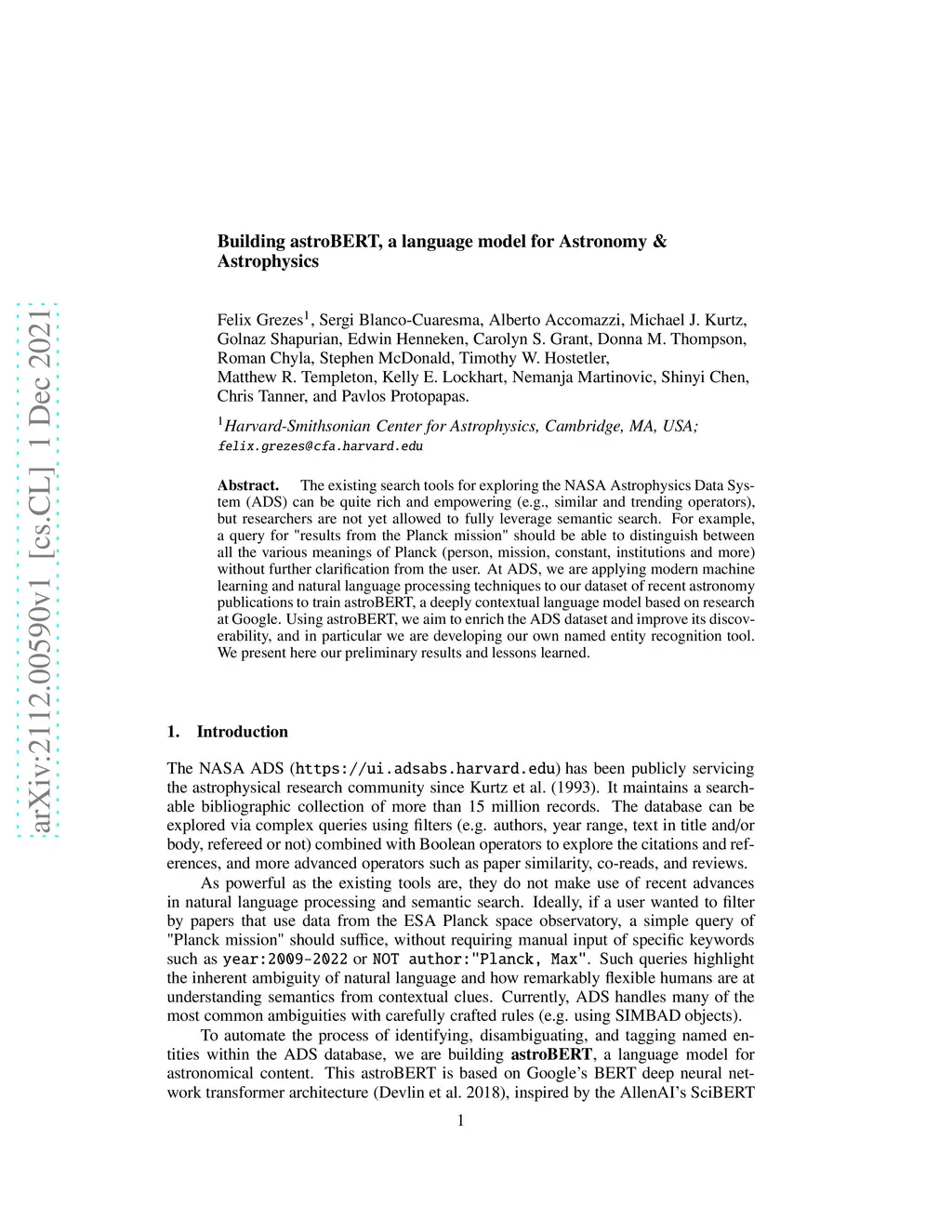 The existing search tools for exploring the NASA Astrophysics Data System (ADS) can be quite rich and empowering (e.g., similar and trending operators), but researchers are not yet allowed to fully leverage semantic search. For example, a query for "results from the Planck mission" should be able to distinguish between all the various meanings of Planck (person, mission, constant, institutions and more) without further clarification from the user. At ADS, we are applying modern machine learning and natural language processing techniques to our dataset of recent astronomy publications to train astroBERT, a deeply contextual language model based on research at Google. Using astroBERT, we aim to enrich the ADS dataset and improve its discoverability, and in particular we are developing our own named entity recognition tool. We present here our preliminary results and lessons learned.