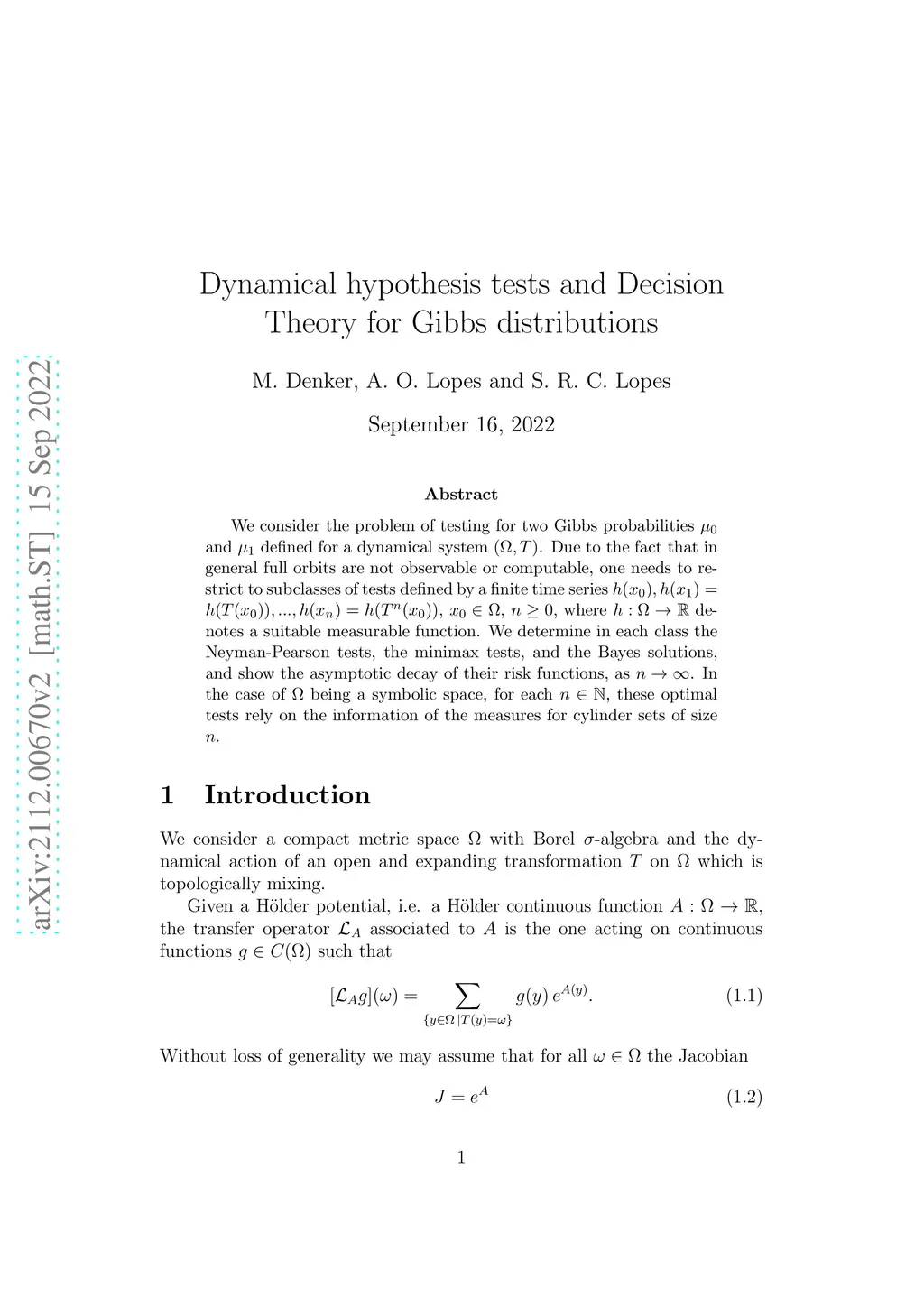 Dynamical hypothesis tests and Decision Theory for Gibbs distributions