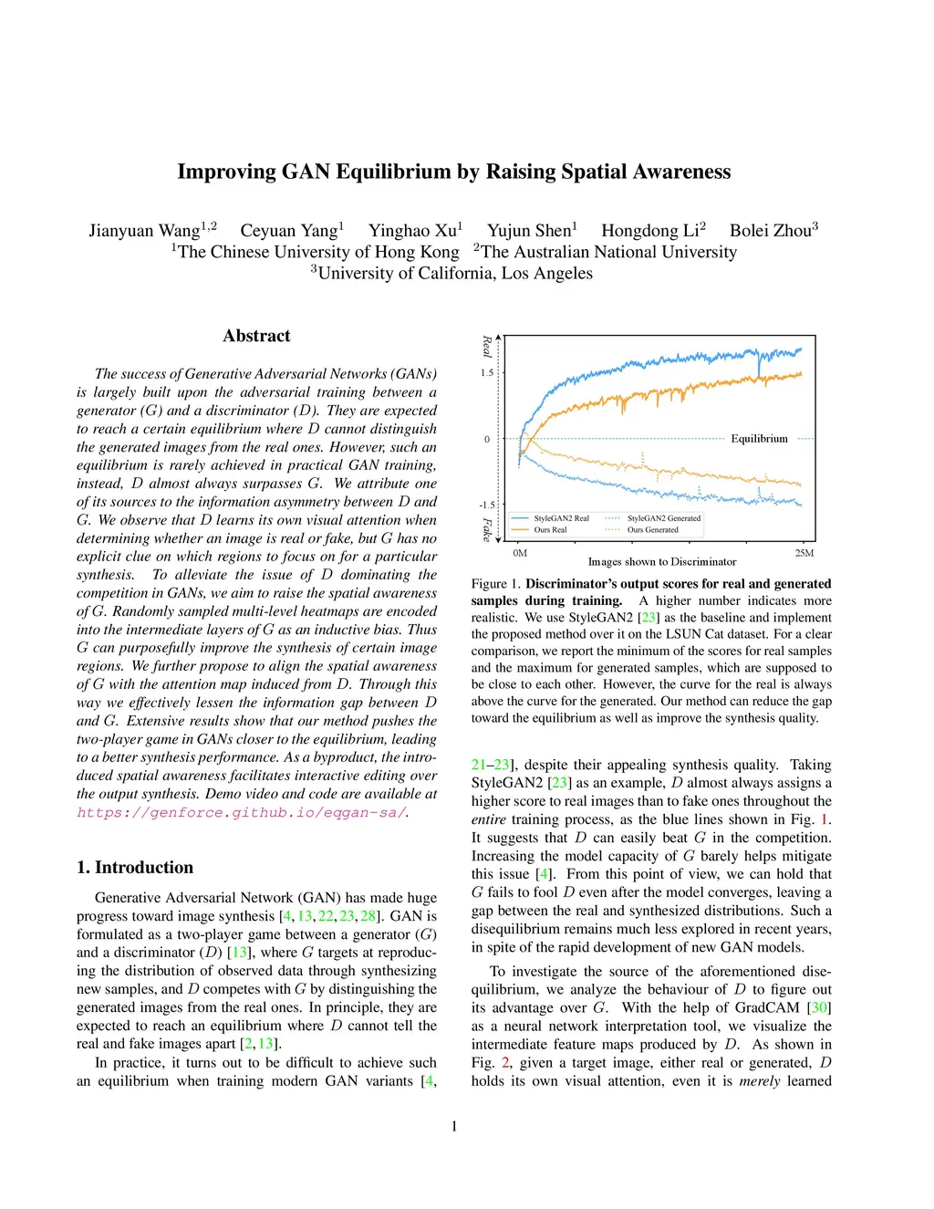 The success of Generative Adversarial Networks (GANs) is largely built upon the adversarial training between a generator (G) and a discriminator (D). They are expected to reach a certain equilibrium where D cannot distinguish the generated images from the real ones. However, such an equilibrium is rarely achieved in practical GAN training, instead, D almost always surpasses G. We attribute one of its sources to the information asymmetry between D and G. We observe that D learns its own visual attention when determining whether an image is real or fake, but G has no explicit clue on which regions to focus on for a particular synthesis. To alleviate the issue of D dominating the competition in GANs, we aim to raise the spatial awareness of G. Randomly sampled multi-level heatmaps are encoded into the intermediate layers of G as an inductive bias. Thus G can purposefully improve the synthesis of certain image regions. We further propose to align the spatial awareness of G with the attention map induced from D. Through this way we effectively lessen the information gap between D and G. Extensive results show that our method pushes the two-player game in GANs closer to the equilibrium, leading to a better synthesis performance. As a byproduct, the introduced spatial awareness facilitates interactive editing over the output synthesis. Demo video and code are available at https://genforce.github.io/eqgan-sa/.