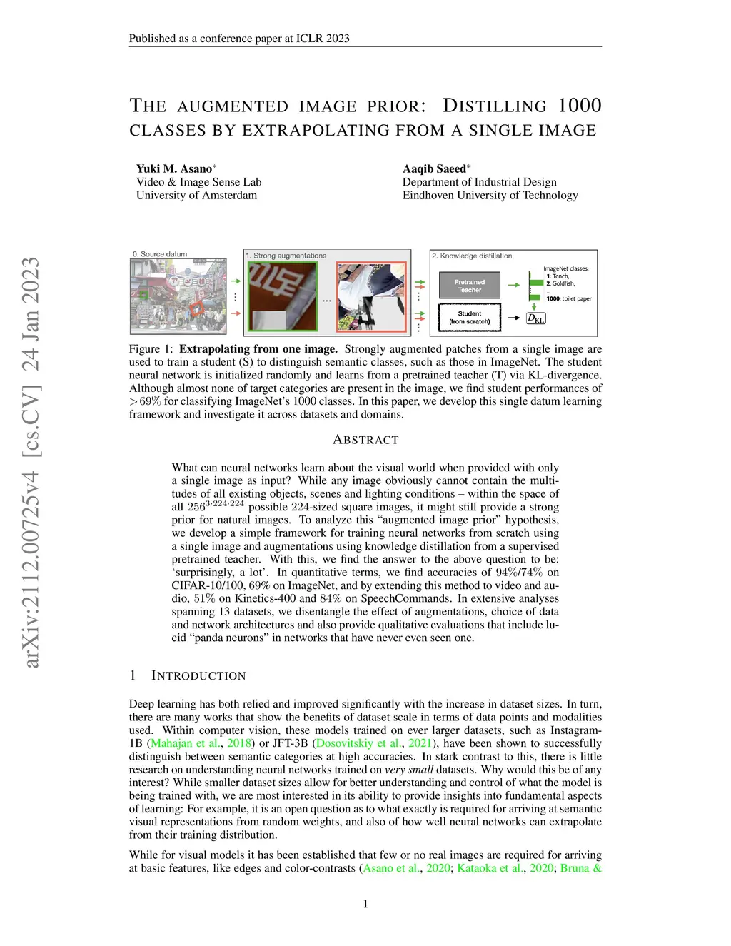 What can neural networks learn about the visual world when provided with only a single image as input? While any image obviously cannot contain the multitudes of all existing objects, scenes and lighting conditions - within the space of all 256^(3x224x224) possible 224-sized square images, it might still provide a strong prior for natural images. To analyze this `augmented image prior' hypothesis, we develop a simple framework for training neural networks from scratch using a single image and augmentations using knowledge distillation from a supervised pretrained teacher. With this, we find the answer to the above question to be: `surprisingly, a lot'. In quantitative terms, we find accuracies of 94%/74% on CIFAR-10/100, 69% on ImageNet, and by extending this method to video and audio, 51% on Kinetics-400 and 84% on SpeechCommands. In extensive analyses spanning 13 datasets, we disentangle the effect of augmentations, choice of data and network architectures and also provide qualitative evaluations that include lucid `panda neurons' in networks that have never even seen one.