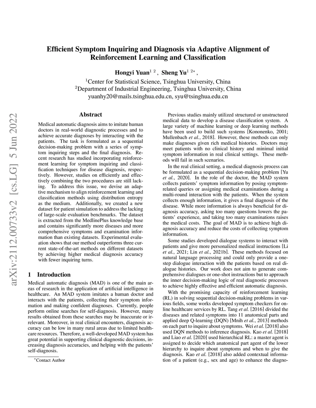 Medical automatic diagnosis aims to imitate human doctors in real-world diagnostic processes and to achieve accurate diagnoses by interacting with the patients. The task is formulated as a sequential decision-making problem with a series of symptom inquiring steps and the final diagnosis. Recent research has studied incorporating reinforcement learning for symptom inquiring and classification techniques for disease diagnosis, respectively. However, studies on efficiently and effectively combining the two procedures are still lacking. To address this issue, we devise an adaptive mechanism to align reinforcement learning and classification methods using distribution entropy as the medium. Additionally, we created a new dataset for patient simulation to address the lacking of large-scale evaluation benchmarks. The dataset is extracted from the MedlinePlus knowledge base and contains significantly more diseases and more comprehensive symptoms and examination information than existing datasets. Experimental evaluation shows that our method outperforms three current state-of-the-art methods on different datasets by achieving higher medical diagnosis accuracy with fewer inquiring turns.