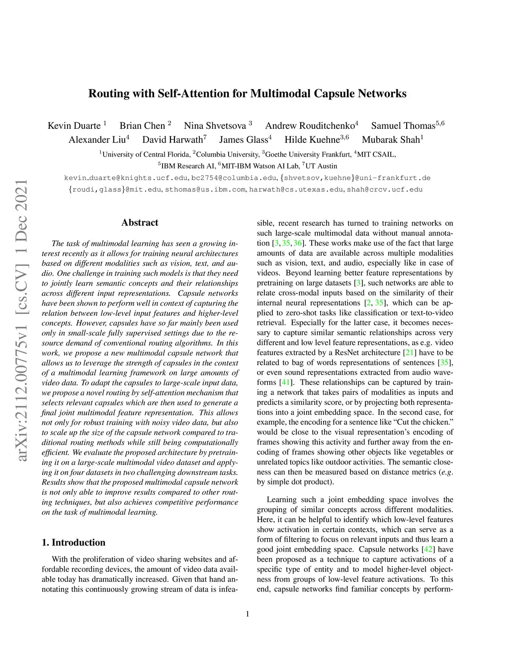 The task of multimodal learning has seen a growing interest recently as it allows for training neural architectures based on different modalities such as vision, text, and audio. One challenge in training such models is that they need to jointly learn semantic concepts and their relationships across different input representations. Capsule networks have been shown to perform well in context of capturing the relation between low-level input features and higher-level concepts. However, capsules have so far mainly been used only in small-scale fully supervised settings due to the resource demand of conventional routing algorithms. We present a new multimodal capsule network that allows us to leverage the strength of capsules in the context of a multimodal learning framework on large amounts of video data. To adapt the capsules to large-scale input data, we propose a novel routing by self-attention mechanism that selects relevant capsules which are then used to generate a final joint multimodal feature representation. This allows not only for robust training with noisy video data, but also to scale up the size of the capsule network compared to traditional routing methods while still being computationally efficient. We evaluate the proposed architecture by pretraining it on a large-scale multimodal video dataset and applying it on four datasets in two challenging downstream tasks. Results show that the proposed multimodal capsule network is not only able to improve results compared to other routing techniques, but also achieves competitive performance on the task of multimodal learning.