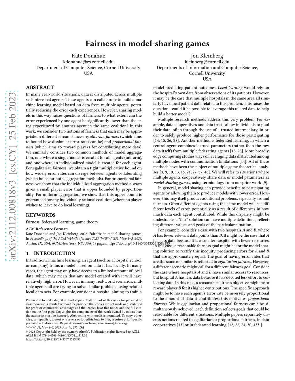 In many real-world situations, data is distributed across multiple self-interested agents. These agents can collaborate to build a machine learning model based on data from multiple agents, potentially reducing the error each experiences. However, sharing models in this way raises questions of fairness: to what extent can the error experienced by one agent be significantly lower than the error experienced by another agent in the same coalition? In this work, we consider two notions of fairness that each may be appropriate in different circumstances: "egalitarian fairness" (which aims to bound how dissimilar error rates can be) and "proportional fairness" (which aims to reward players for contributing more data). We similarly consider two common methods of model aggregation, one where a single model is created for all agents (uniform), and one where an individualized model is created for each agent. For egalitarian fairness, we obtain a tight multiplicative bound on how widely error rates can diverge between agents collaborating (which holds for both aggregation methods). For proportional fairness, we show that the individualized aggregation method always gives a small player error that is upper bounded by proportionality. For uniform aggregation, we show that this upper bound is guaranteed for any individually rational coalition (where no player wishes to leave to do local learning).