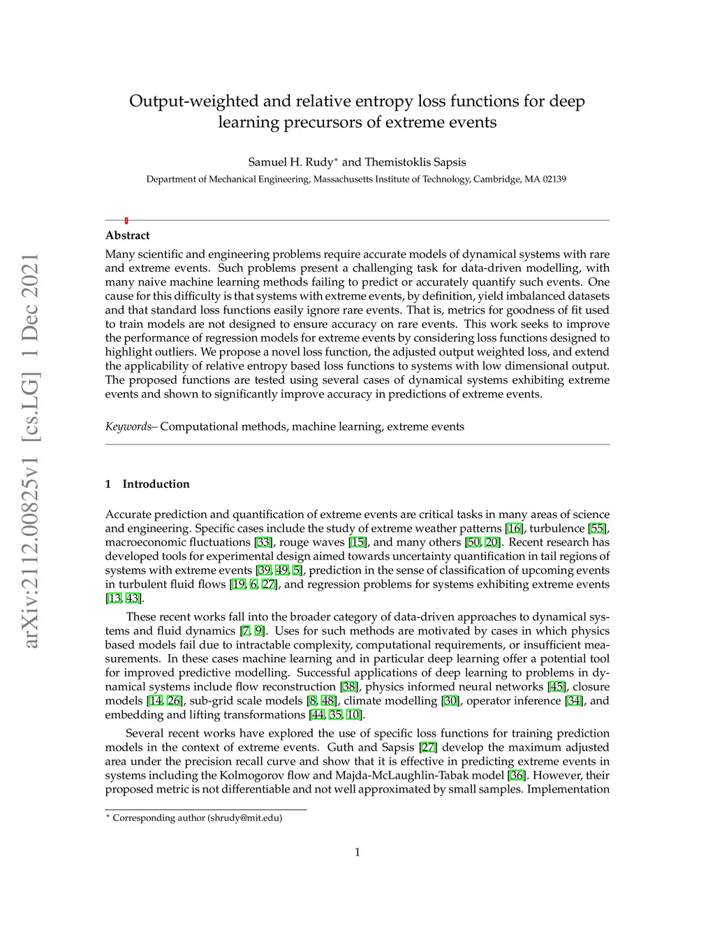 Many scientific and engineering problems require accurate models of dynamical systems with rare and extreme events. Such problems present a challenging task for data-driven modelling, with many naive machine learning methods failing to predict or accurately quantify such events. One cause for this difficulty is that systems with extreme events, by definition, yield imbalanced datasets and that standard loss functions easily ignore rare events. That is, metrics for goodness of fit used to train models are not designed to ensure accuracy on rare events. This work seeks to improve the performance of regression models for extreme events by considering loss functions designed to highlight outliers. We propose a novel loss function, the adjusted output weighted loss, and extend the applicability of relative entropy based loss functions to systems with low dimensional output. The proposed functions are tested using several cases of dynamical systems exhibiting extreme events and shown to significantly improve accuracy in predictions of extreme events.