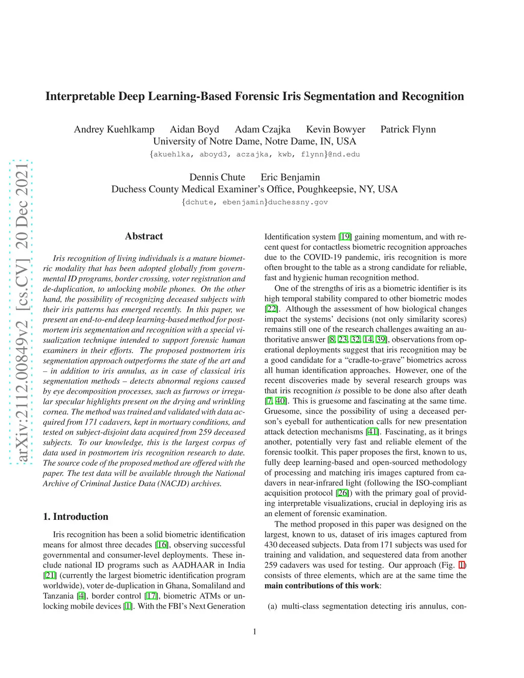 Iris recognition of living individuals is a mature biometric modality that has been adopted globally from governmental ID programs, border crossing, voter registration and de-duplication, to unlocking mobile phones. On the other hand, the possibility of recognizing deceased subjects with their iris patterns has emerged recently. In this paper, we present an end-to-end deep learning-based method for postmortem iris segmentation and recognition with a special visualization technique intended to support forensic human examiners in their efforts. The proposed postmortem iris segmentation approach outperforms the state of the art and in addition to iris annulus, as in case of classical iris segmentation methods - detects abnormal regions caused by eye decomposition processes, such as furrows or irregular specular highlights present on the drying and wrinkling cornea. The method was trained and validated with data acquired from 171 cadavers, kept in mortuary conditions, and tested on subject-disjoint data acquired from 259 deceased subjects. To our knowledge, this is the largest corpus of data used in postmortem iris recognition research to date. The source code of the proposed method are offered with the paper. The test data will be available through the National Archive of Criminal Justice Data (NACJD) archives.