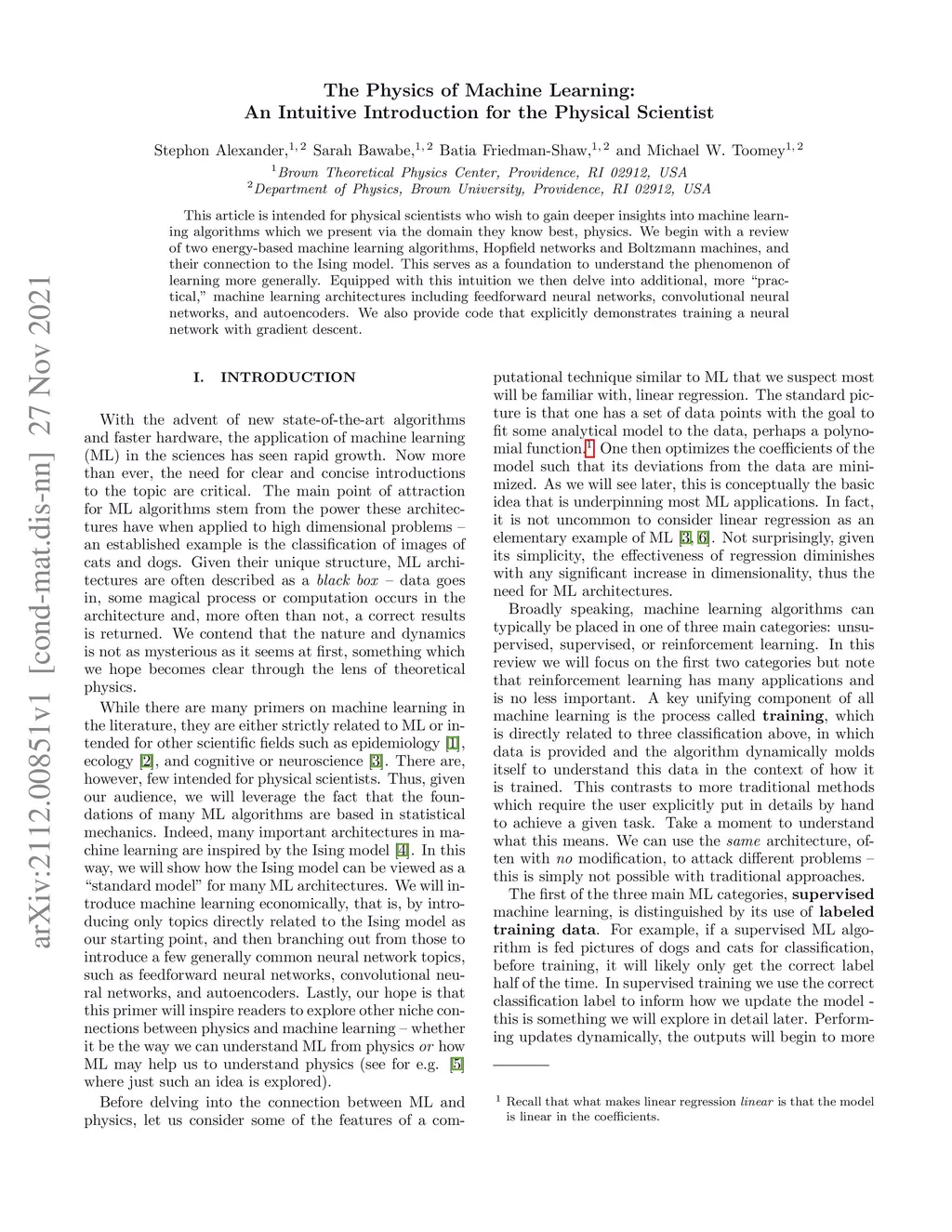 This article is intended for physical scientists who wish to gain deeper insights into machine learning algorithms which we present via the domain they know best, physics. We begin with a review of two energy-based machine learning algorithms, Hopfield networks and Boltzmann machines, and their connection to the Ising model. This serves as a foundation to understand the phenomenon of learning more generally. Equipped with this intuition we then delve into additional, more "practical," machine learning architectures including feedforward neural networks, convolutional neural networks, and autoencoders. We also provide code that explicitly demonstrates training a neural network with gradient descent.