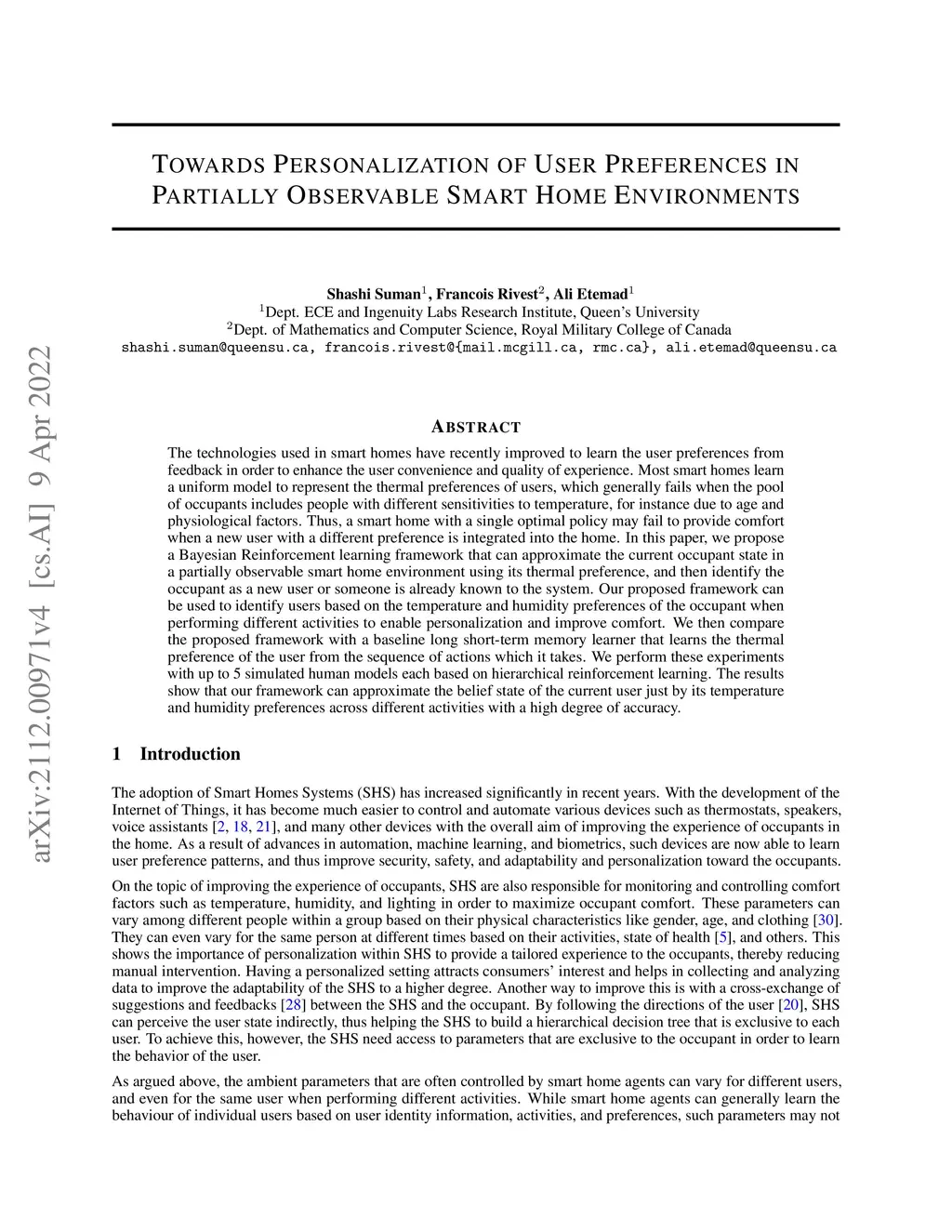 The technologies used in smart homes have recently improved to learn the user preferences from feedback in order to enhance the user convenience and quality of experience. Most smart homes learn a uniform model to represent the thermal preferences of users, which generally fails when the pool of occupants includes people with different sensitivities to temperature, for instance due to age and physiological factors. Thus, a smart home with a single optimal policy may fail to provide comfort when a new user with a different preference is integrated into the home. In this paper, we propose a Bayesian Reinforcement learning framework that can approximate the current occupant state in a partially observable smart home environment using its thermal preference, and then identify the occupant as a new user or someone is already known to the system. Our proposed framework can be used to identify users based on the temperature and humidity preferences of the occupant when performing different activities to enable personalization and improve comfort. We then compare the proposed framework with a baseline long short-term memory learner that learns the thermal preference of the user from the sequence of actions which it takes. We perform these experiments with up to 5 simulated human models each based on hierarchical reinforcement learning. The results show that our framework can approximate the belief state of the current user just by its temperature and humidity preferences across different activities with a high degree of accuracy.