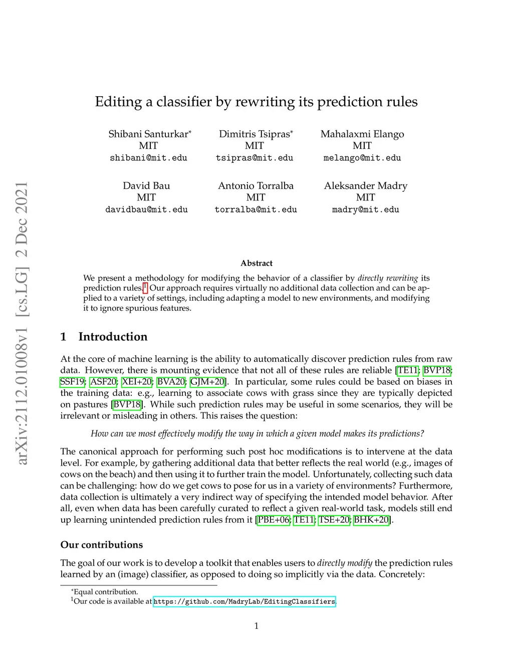 We present a methodology for modifying the behavior of a classifier by directly rewriting its prediction rules. Our approach requires virtually no additional data collection and can be applied to a variety of settings, including adapting a model to new environments, and modifying it to ignore spurious features. Our code is available at https://github.com/MadryLab/EditingClassifiers .