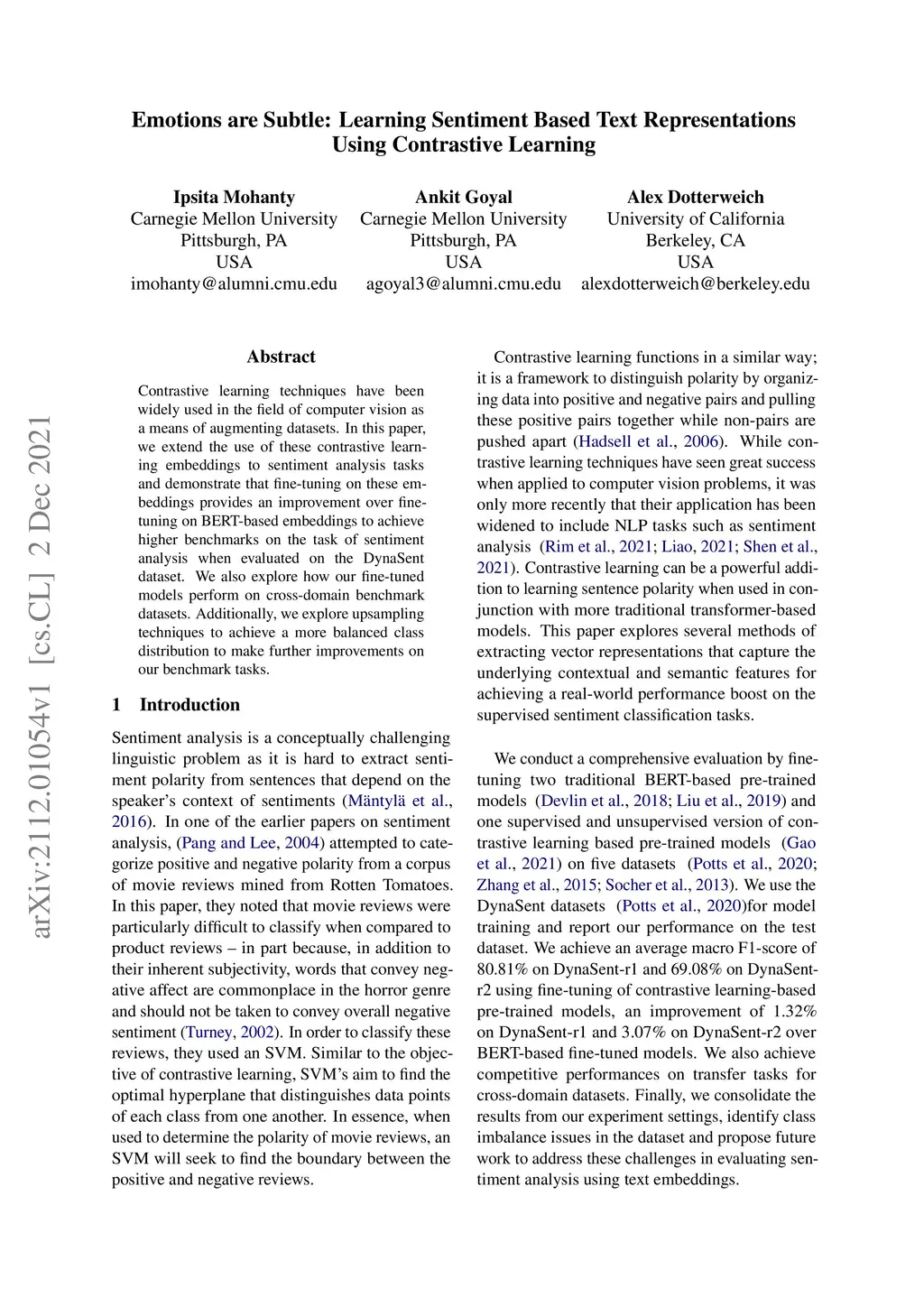 Contrastive learning techniques have been widely used in the field of computer vision as a means of augmenting datasets. In this paper, we extend the use of these contrastive learning embeddings to sentiment analysis tasks and demonstrate that fine-tuning on these embeddings provides an improvement over fine-tuning on BERT-based embeddings to achieve higher benchmarks on the task of sentiment analysis when evaluated on the DynaSent dataset. We also explore how our fine-tuned models perform on cross-domain benchmark datasets. Additionally, we explore upsampling techniques to achieve a more balanced class distribution to make further improvements on our benchmark tasks.