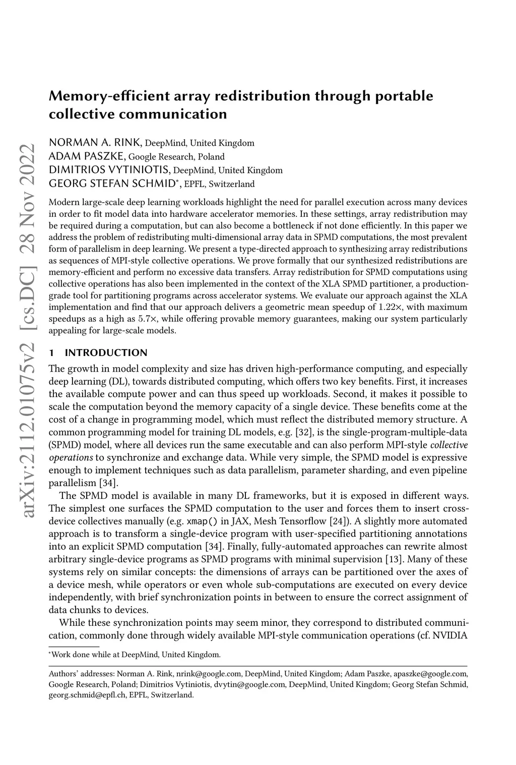 Modern large-scale deep learning workloads highlight the need for parallel execution across many devices in order to fit model data into hardware accelerator memories. In these settings, array redistribution may be required during a computation, but can also become a bottleneck if not done efficiently. In this paper we address the problem of redistributing multi-dimensional array data in SPMD computations, the most prevalent form of parallelism in deep learning. We present a type-directed approach to synthesizing array redistributions as sequences of MPI-style collective operations. We prove formally that our synthesized redistributions are memory-efficient and perform no excessive data transfers. Array redistribution for SPMD computations using collective operations has also been implemented in the context of the XLA SPMD partitioner, a production-grade tool for partitioning programs across accelerator systems. We evaluate our approach against the XLA implementation and find that our approach delivers a geometric mean speedup of , with maximum speedups as a high as , while offering provable memory guarantees, making our system particularly appealing for large-scale models.