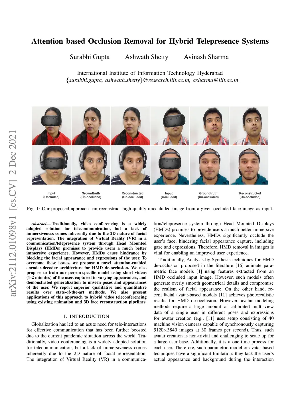 Traditionally, video conferencing is a widely adopted solution for telecommunication, but a lack of immersiveness comes inherently due to the 2D nature of facial representation. The integration of Virtual Reality (VR) in a communication/telepresence system through Head Mounted Displays (HMDs) promises to provide users a much better immersive experience. However, HMDs cause hindrance by blocking the facial appearance and expressions of the user. To overcome these issues, we propose a novel attention-enabled encoder-decoder architecture for HMD de-occlusion. We also propose to train our person-specific model using short videos (1-2 minutes) of the user, captured in varying appearances, and demonstrated generalization to unseen poses and appearances of the user. We report superior qualitative and quantitative results over state-of-the-art methods. We also present applications of this approach to hybrid video teleconferencing using existing animation and 3D face reconstruction pipelines.