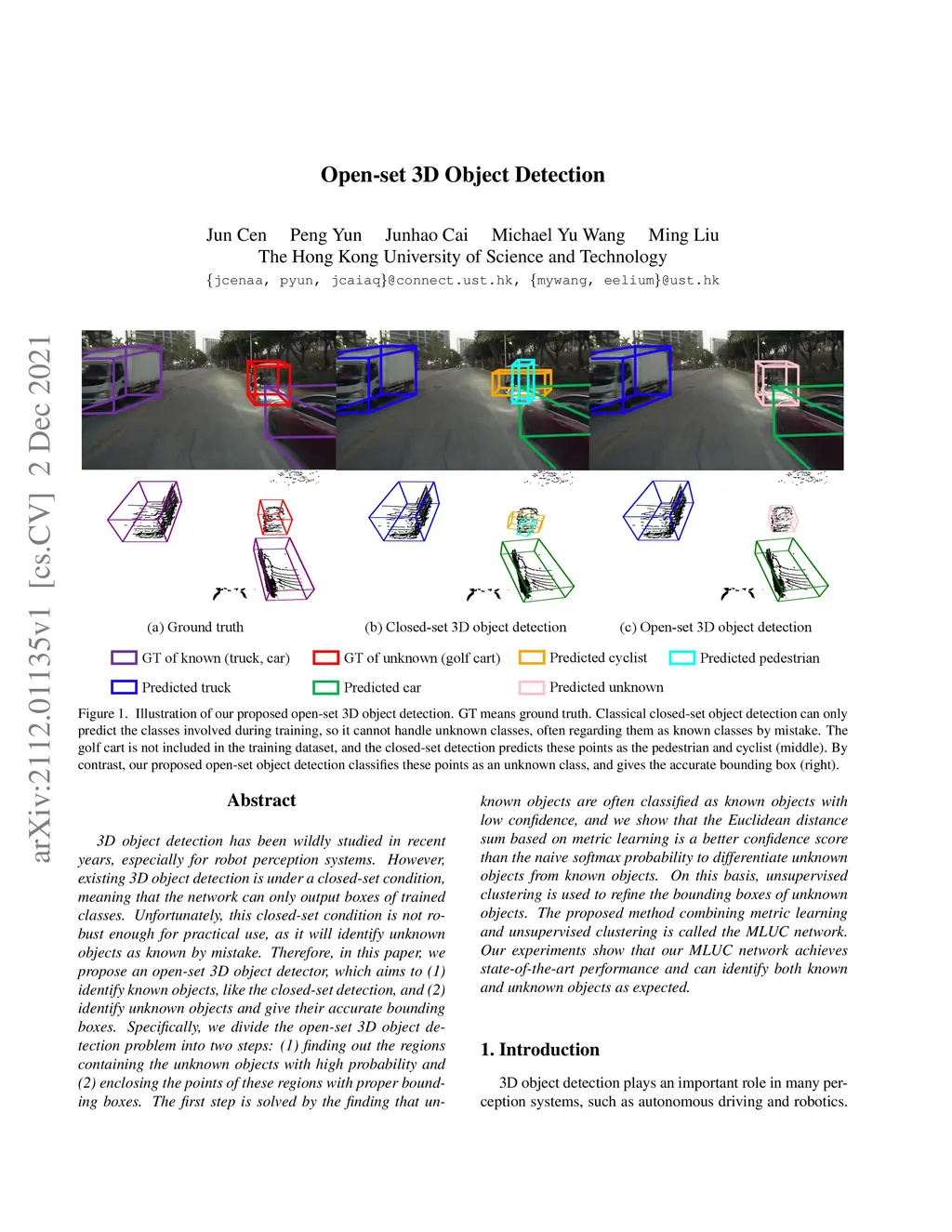 3D object detection has been wildly studied in recent years, especially for robot perception systems. However, existing 3D object detection is under a closed-set condition, meaning that the network can only output boxes of trained classes. Unfortunately, this closed-set condition is not robust enough for practical use, as it will identify unknown objects as known by mistake. Therefore, in this paper, we propose an open-set 3D object detector, which aims to (1) identify known objects, like the closed-set detection, and (2) identify unknown objects and give their accurate bounding boxes. Specifically, we divide the open-set 3D object detection problem into two steps: (1) finding out the regions containing the unknown objects with high probability and (2) enclosing the points of these regions with proper bounding boxes. The first step is solved by the finding that unknown objects are often classified as known objects with low confidence, and we show that the Euclidean distance sum based on metric learning is a better confidence score than the naive softmax probability to differentiate unknown objects from known objects. On this basis, unsupervised clustering is used to refine the bounding boxes of unknown objects. The proposed method combining metric learning and unsupervised clustering is called the MLUC network. Our experiments show that our MLUC network achieves state-of-the-art performance and can identify both known and unknown objects as expected.