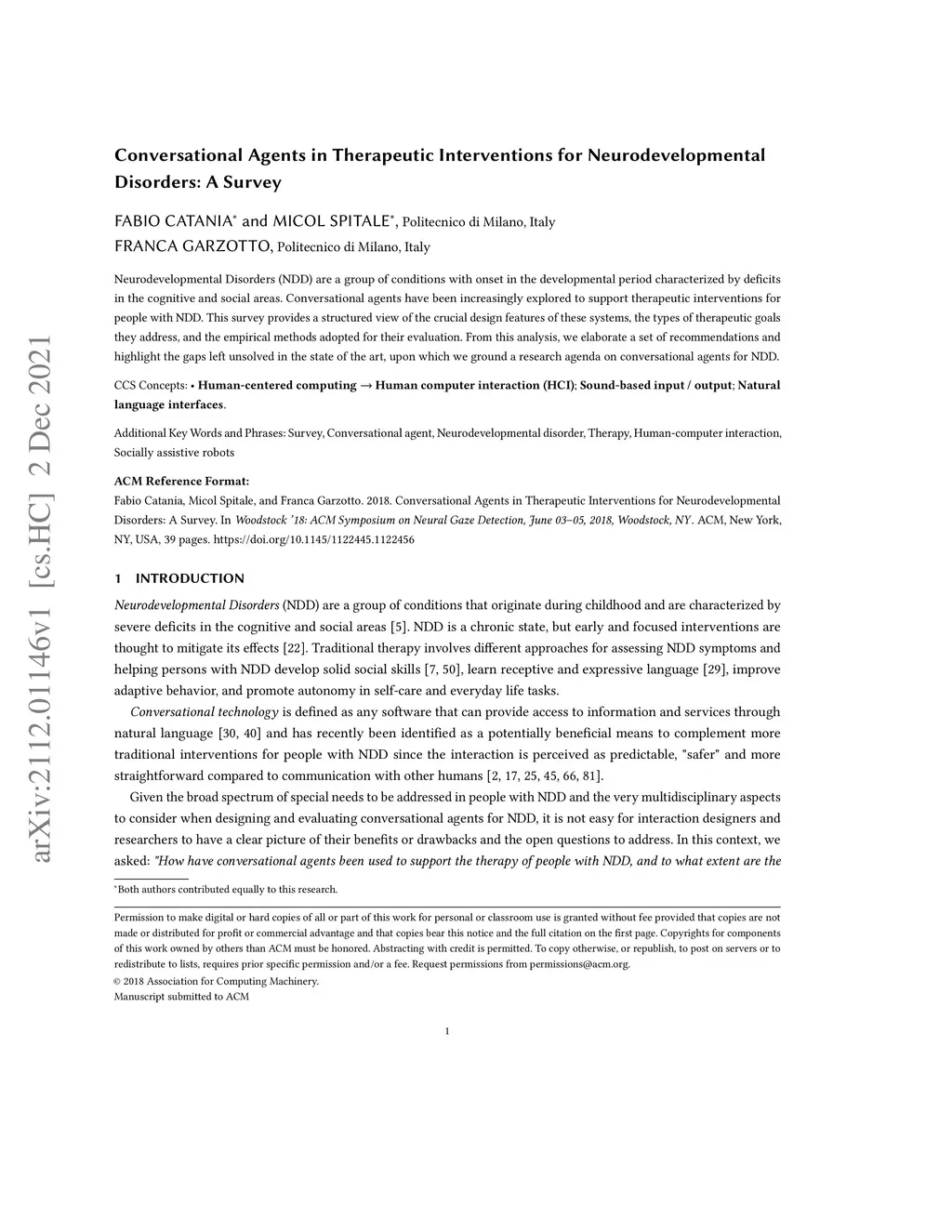 Neurodevelopmental Disorders (NDD) are a group of conditions with onset in the developmental period characterized by deficits in the cognitive and social areas. Conversational agents have been increasingly explored to support therapeutic interventions for people with NDD. This survey provides a structured view of the crucial design features of these systems, the types of therapeutic goals they address, and the empirical methods adopted for their evaluation. From this analysis, we elaborate a set of recommendations and highlight the gaps left unsolved in the state of the art, upon which we ground a research agenda on conversational agents for NDD.