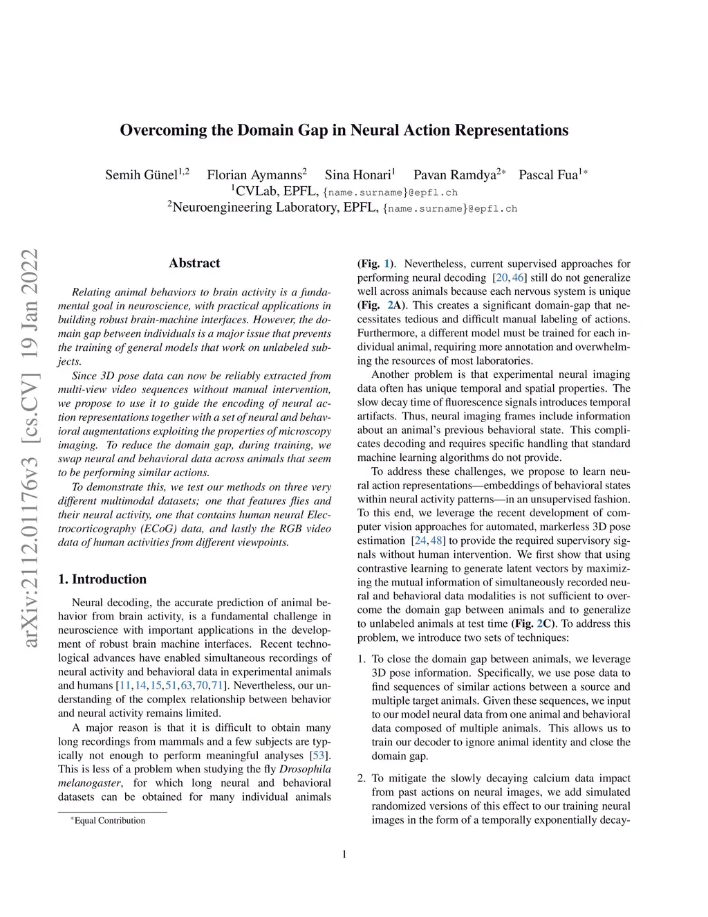 Relating animal behaviors to brain activity is a fundamental goal in neuroscience, with practical applications in building robust brain-machine interfaces. However, the domain gap between individuals is a major issue that prevents the training of general models that work on unlabeled subjects. Since 3D pose data can now be reliably extracted from multi-view video sequences without manual intervention, we propose to use it to guide the encoding of neural action representations together with a set of neural and behavioral augmentations exploiting the properties of microscopy imaging. To reduce the domain gap, during training, we swap neural and behavioral data across animals that seem to be performing similar actions. To demonstrate this, we test our methods on three very different multimodal datasets; one that features flies and their neural activity, one that contains human neural Electrocorticography (ECoG) data, and lastly the RGB video data of human activities from different viewpoints.