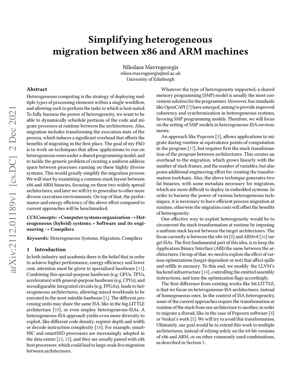 Heterogeneous computing is the strategy of deploying multiple types of processing elements within a single workflow, and allowing each to perform the tasks to which is best suited. To fully harness the power of heterogeneity, we want to be able to dynamically schedule portions of the code and migrate processes at runtime between the architectures. Also, migration includes transforming the execution state of the process, which induces a significant overhead that offsets the benefits of migrating in the first place. The goal of my PhD is to work on techniques that allow applications to run on heterogeneous cores under a shared programming model, and to tackle the generic problem of creating a uniform address space between processes running on these highly diverse systems. This would greatly simplify the migration process. We will start by examining a common stack layout between x86 and ARM binaries, focusing on these two widely spread architectures, and later we will try to generalize to other more diverse execution environments. On top of that, the performance and energy efficiency of the above effort compared to current approaches will be benchmarked.