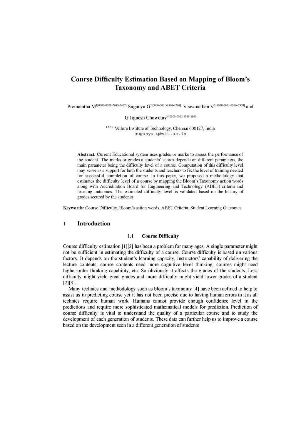 Current Educational system uses grades or marks to assess the performance of the student. The marks or grades a students scores depends on different parameters, the main parameter being the difficulty level of a course. Computation of this difficulty level may serve as a support for both the students and teachers to fix the level of training needed for successful completion of course. In this paper, we proposed a methodology that estimates the difficulty level of a course by mapping the Bloom's Taxonomy action words along with Accreditation Board for Engineering and Technology (ABET) criteria and learning outcomes. The estimated difficulty level is validated based on the history of grades secured by the students.