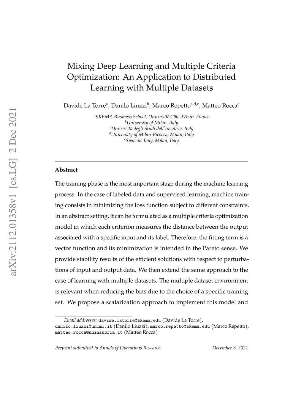 The training phase is the most important stage during the machine learning process. In the case of labeled data and supervised learning, machine training consists in minimizing the loss function subject to different constraints. In an abstract setting, it can be formulated as a multiple criteria optimization model in which each criterion measures the distance between the output associated with a specific input and its label. Therefore, the fitting term is a vector function and its minimization is intended in the Pareto sense. We provide stability results of the efficient solutions with respect to perturbations of input and output data. We then extend the same approach to the case of learning with multiple datasets. The multiple dataset environment is relevant when reducing the bias due to the choice of a specific training set. We propose a scalarization approach to implement this model and numerical experiments in digit classification using MNIST data.