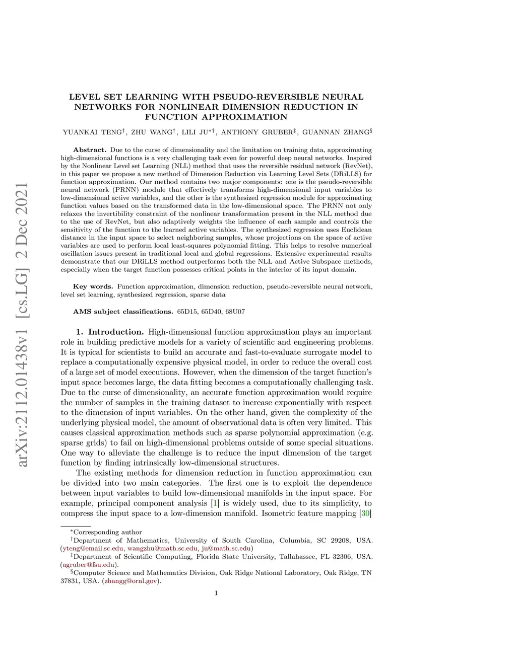 Due to the curse of dimensionality and the limitation on training data, approximating high-dimensional functions is a very challenging task even for powerful deep neural networks. Inspired by the Nonlinear Level set Learning (NLL) method that uses the reversible residual network (RevNet), in this paper we propose a new method of Dimension Reduction via Learning Level Sets (DRiLLS) for function approximation. Our method contains two major components: one is the pseudo-reversible neural network (PRNN) module that effectively transforms high-dimensional input variables to low-dimensional active variables, and the other is the synthesized regression module for approximating function values based on the transformed data in the low-dimensional space. The PRNN not only relaxes the invertibility constraint of the nonlinear transformation present in the NLL method due to the use of RevNet, but also adaptively weights the influence of each sample and controls the sensitivity of the function to the learned active variables. The synthesized regression uses Euclidean distance in the input space to select neighboring samples, whose projections on the space of active variables are used to perform local least-squares polynomial fitting. This helps to resolve numerical oscillation issues present in traditional local and global regressions. Extensive experimental results demonstrate that our DRiLLS method outperforms both the NLL and Active Subspace methods, especially when the target function possesses critical points in the interior of its input domain.