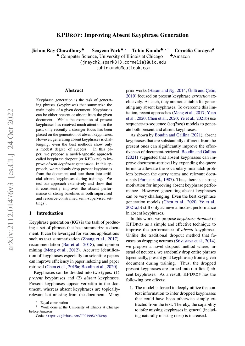 Keyphrase generation is the task of generating phrases (keyphrases) that summarize the main topics of a given document. Keyphrases can be either present or absent from the given document. While the extraction of present keyphrases has received much attention in the past, only recently a stronger focus has been placed on the generation of absent keyphrases. However, generating absent keyphrases is challenging; even the best methods show only a modest degree of success. In this paper, we propose a model-agnostic approach called keyphrase dropout (or KPDrop) to improve absent keyphrase generation. In this approach, we randomly drop present keyphrases from the document and turn them into artificial absent keyphrases during training. We test our approach extensively and show that it consistently improves the absent performance of strong baselines in both supervised and resource-constrained semi-supervised settings.